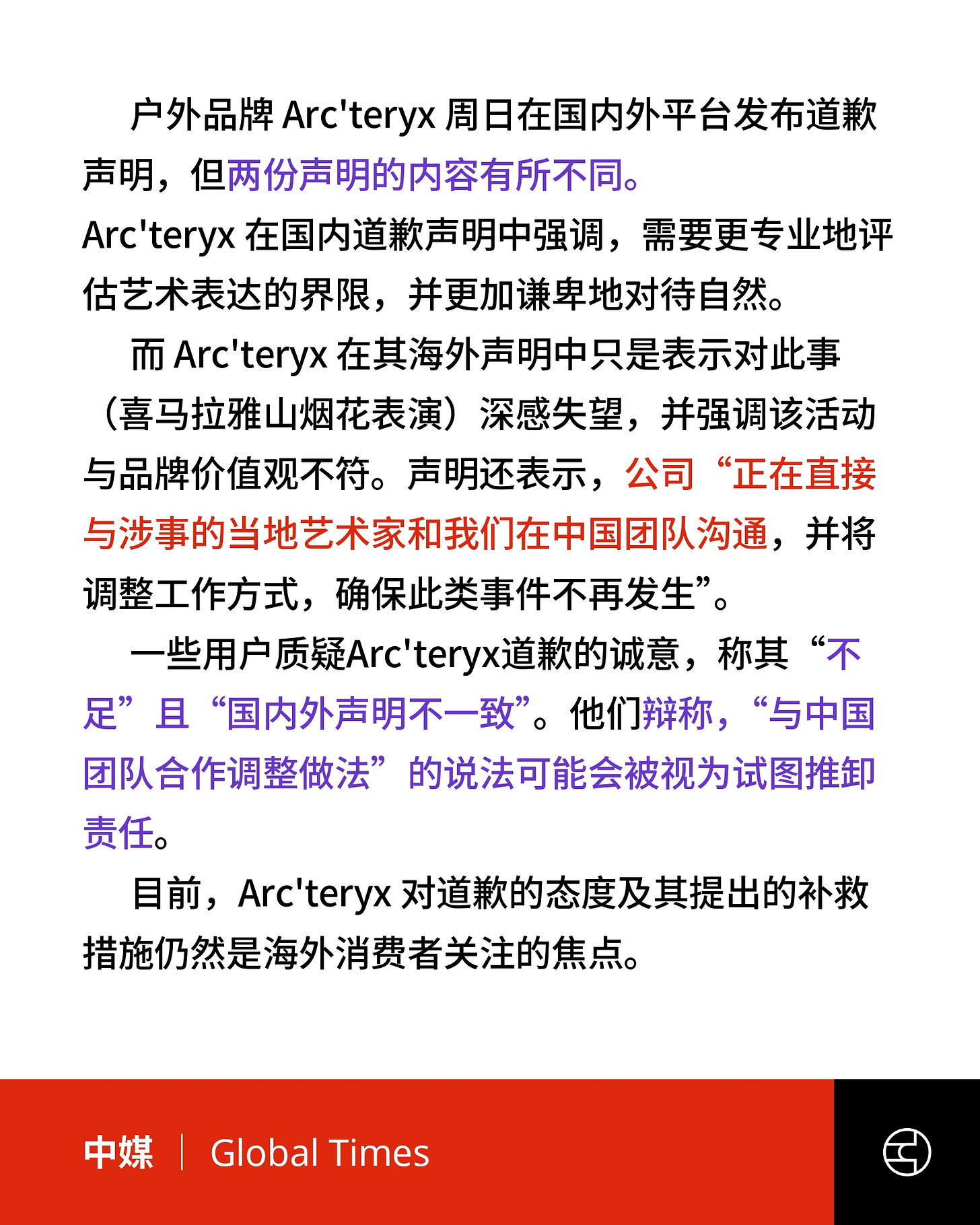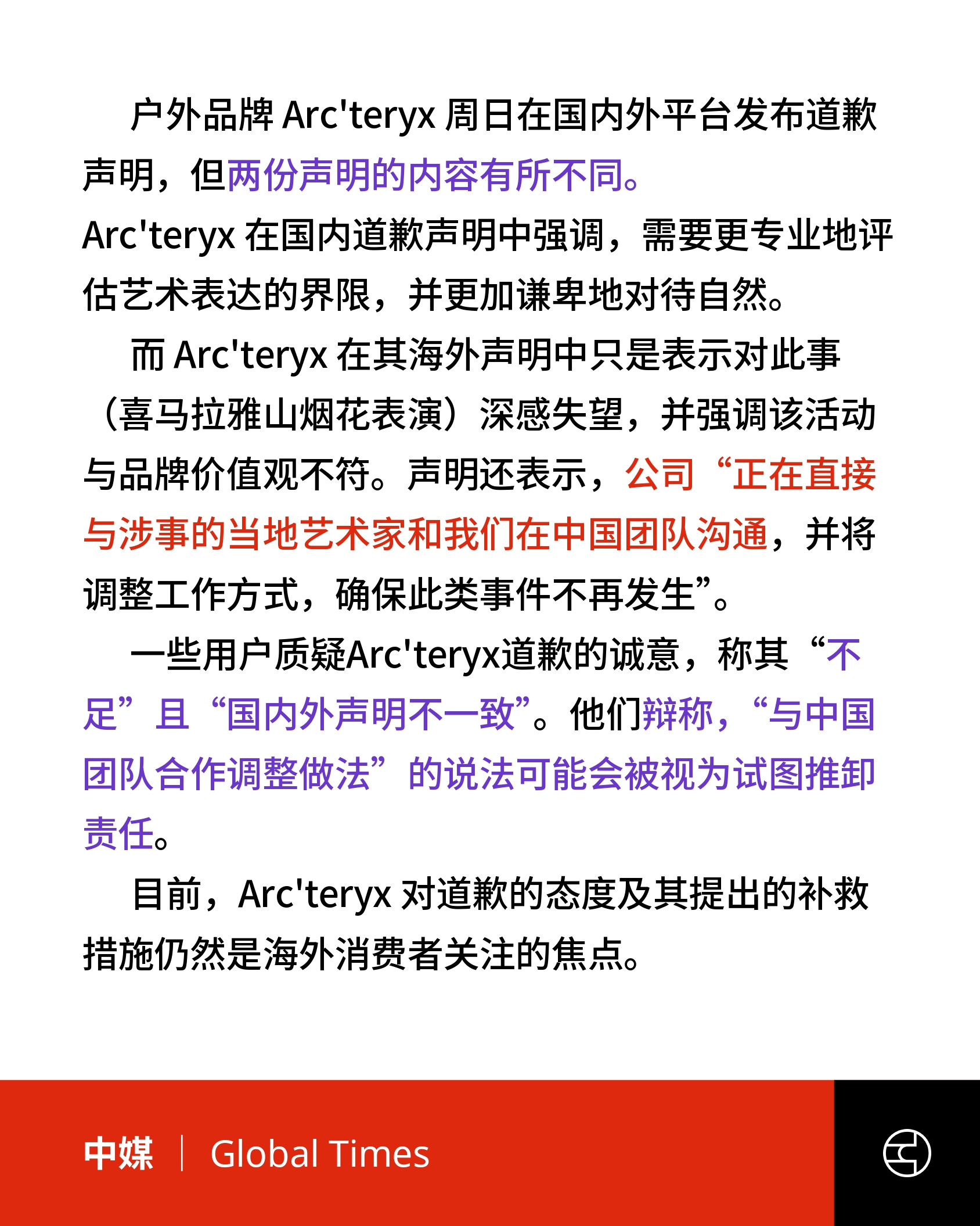 《Global Times》Arc'teryx 道歉内容出入引发争议,诚意仍需考量:公众声音