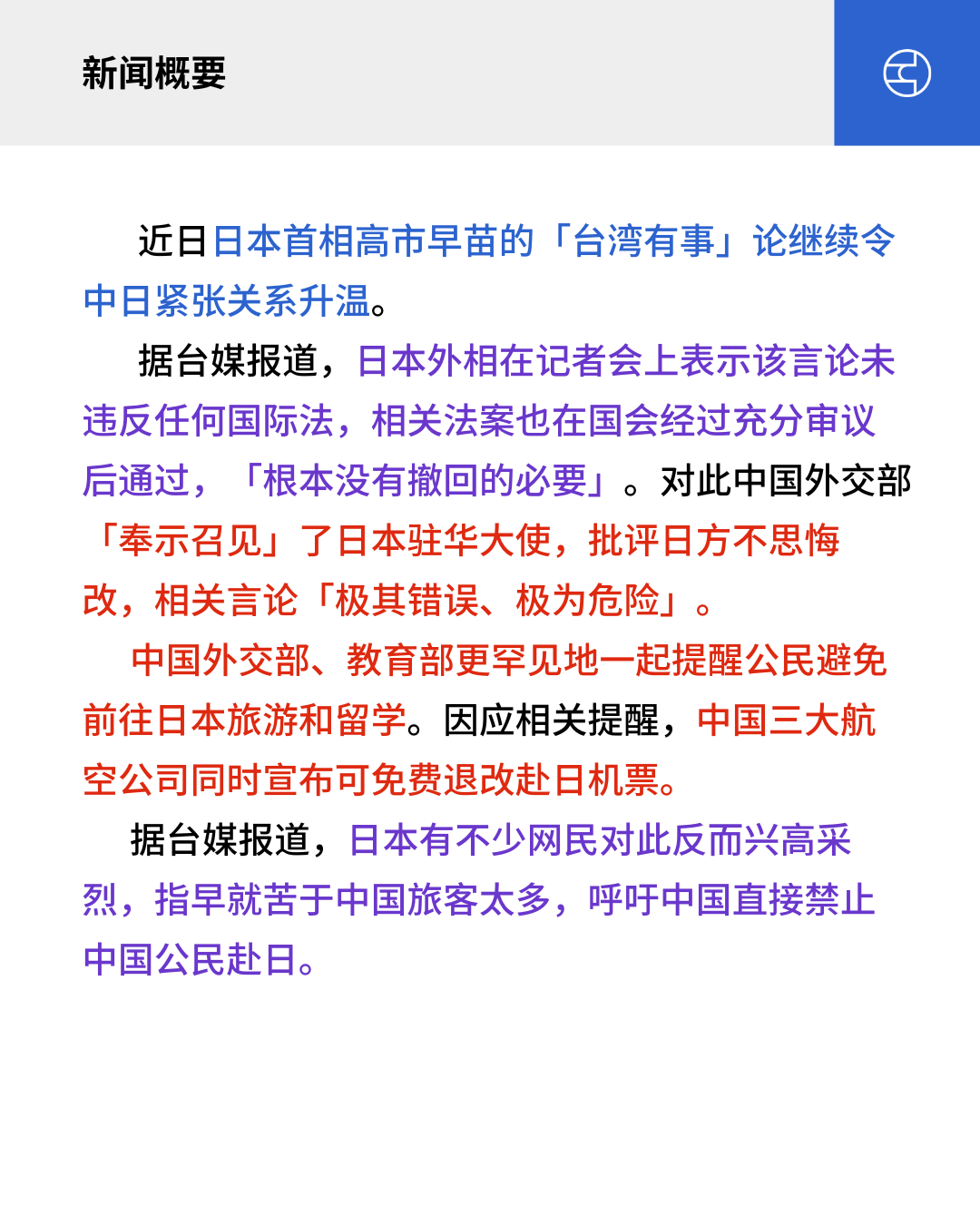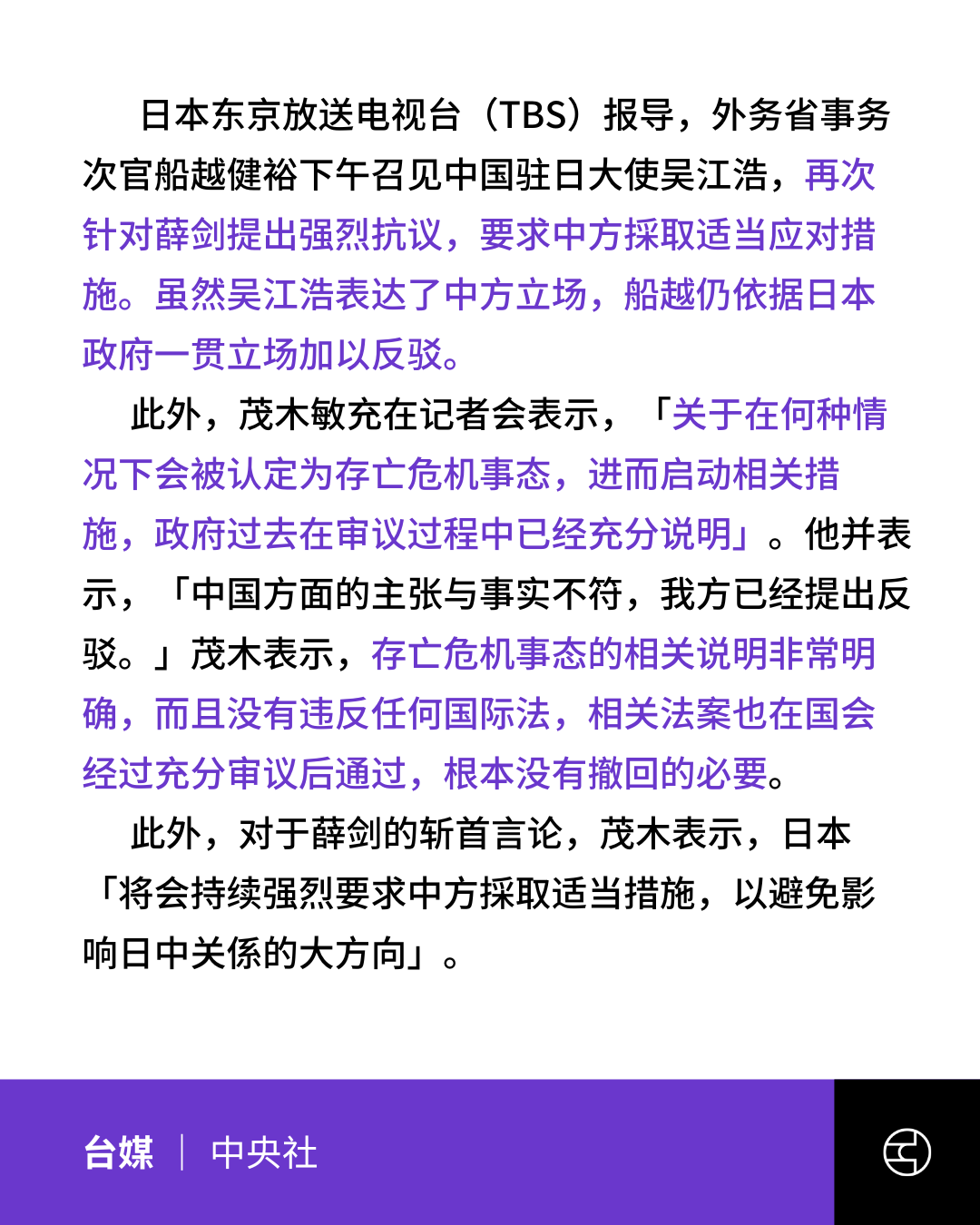 据台媒报道,日本外相在记者会上表示该言论未违反任何国际法,相关法案也在国会经过充分审议后通过,「根本没有撤回的必要」。对此中国外交部「奉示召见」了日本驻华大使,批评日方不思悔改,相关言论「极其错误、极为危险」。