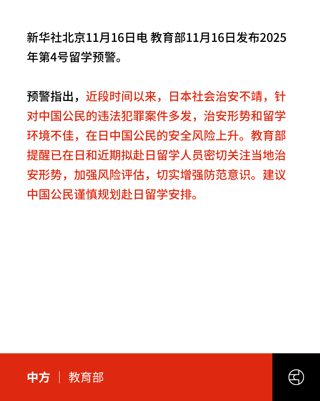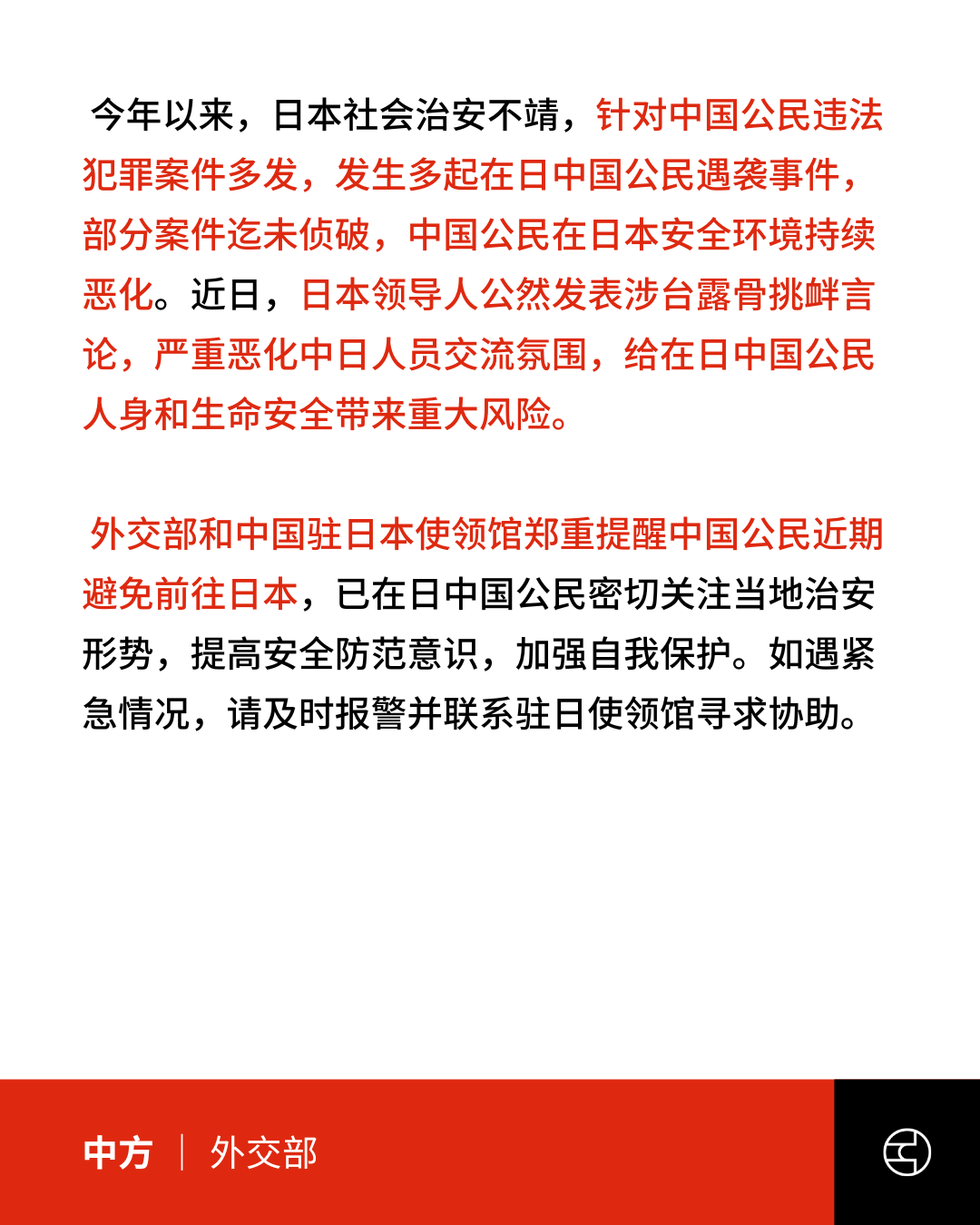 《中国驻日本大使馆》提醒中国公民近期避免前往日本