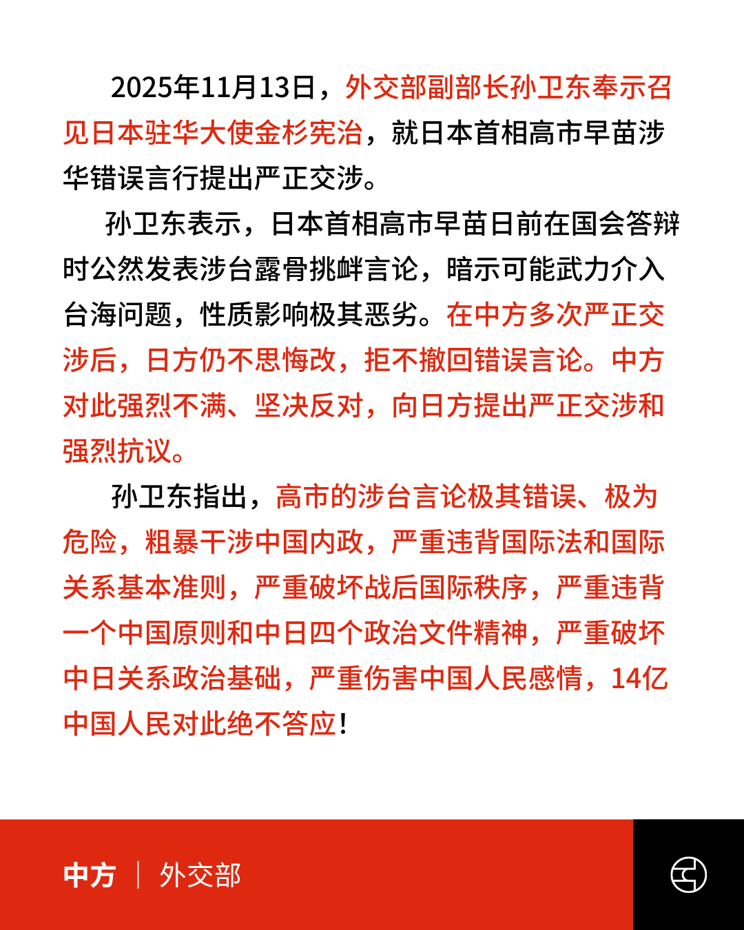 《外交部》外交部副部长孙卫东就日本首相高市早苗涉华错误言行提出严正交涉