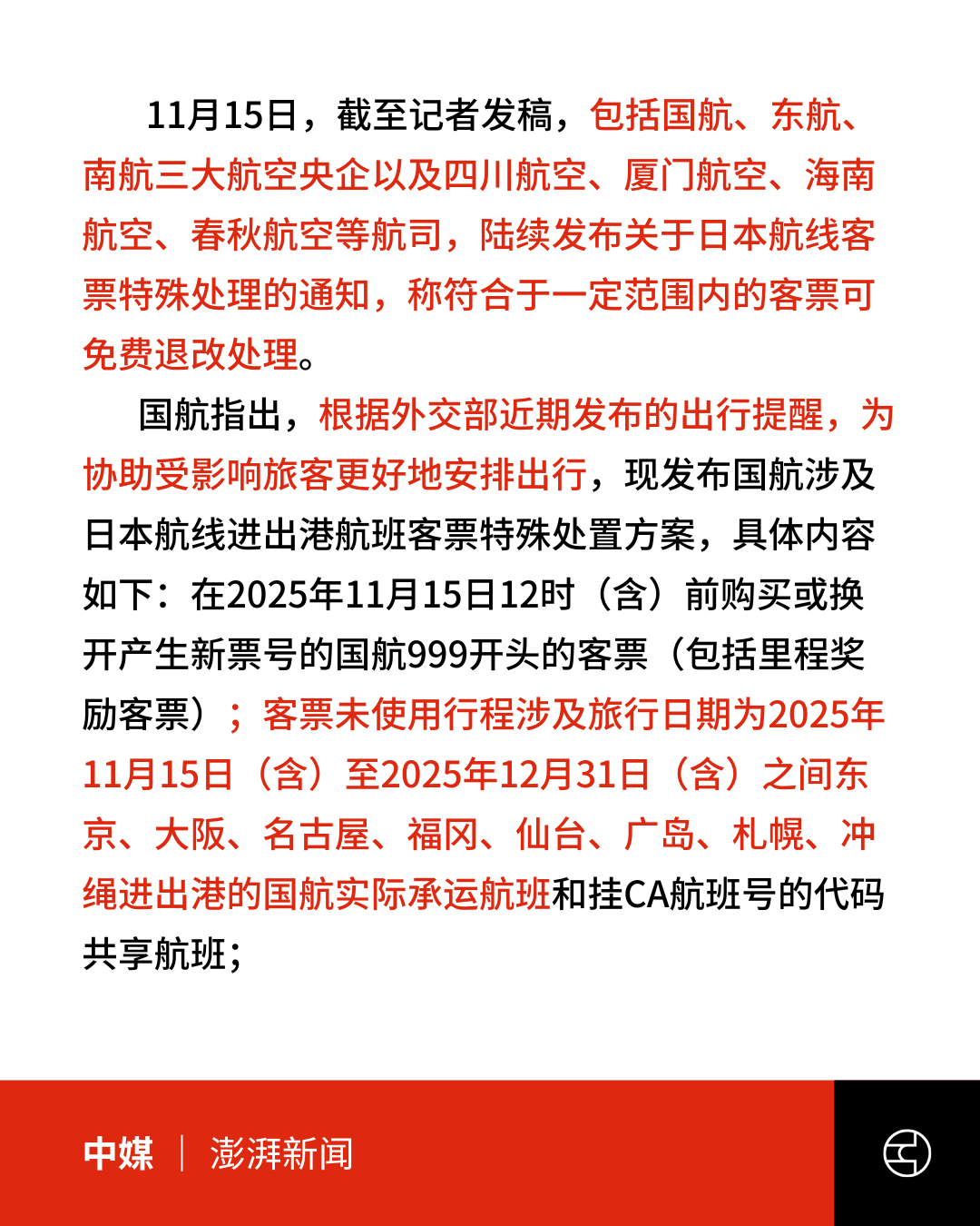 《澎湃新闻》多家航司发布日本航线客票处理通知:机票可免费退改
