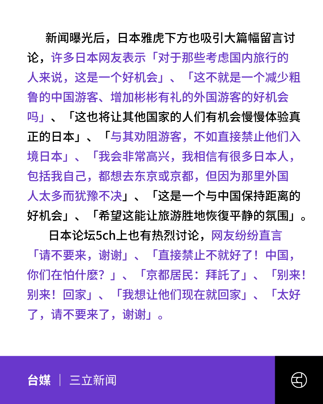 据台媒报道,日本有不少网民对此反而兴高采烈,指早就苦于中国旅客太多,呼吁中国直接禁止中国公民赴日。