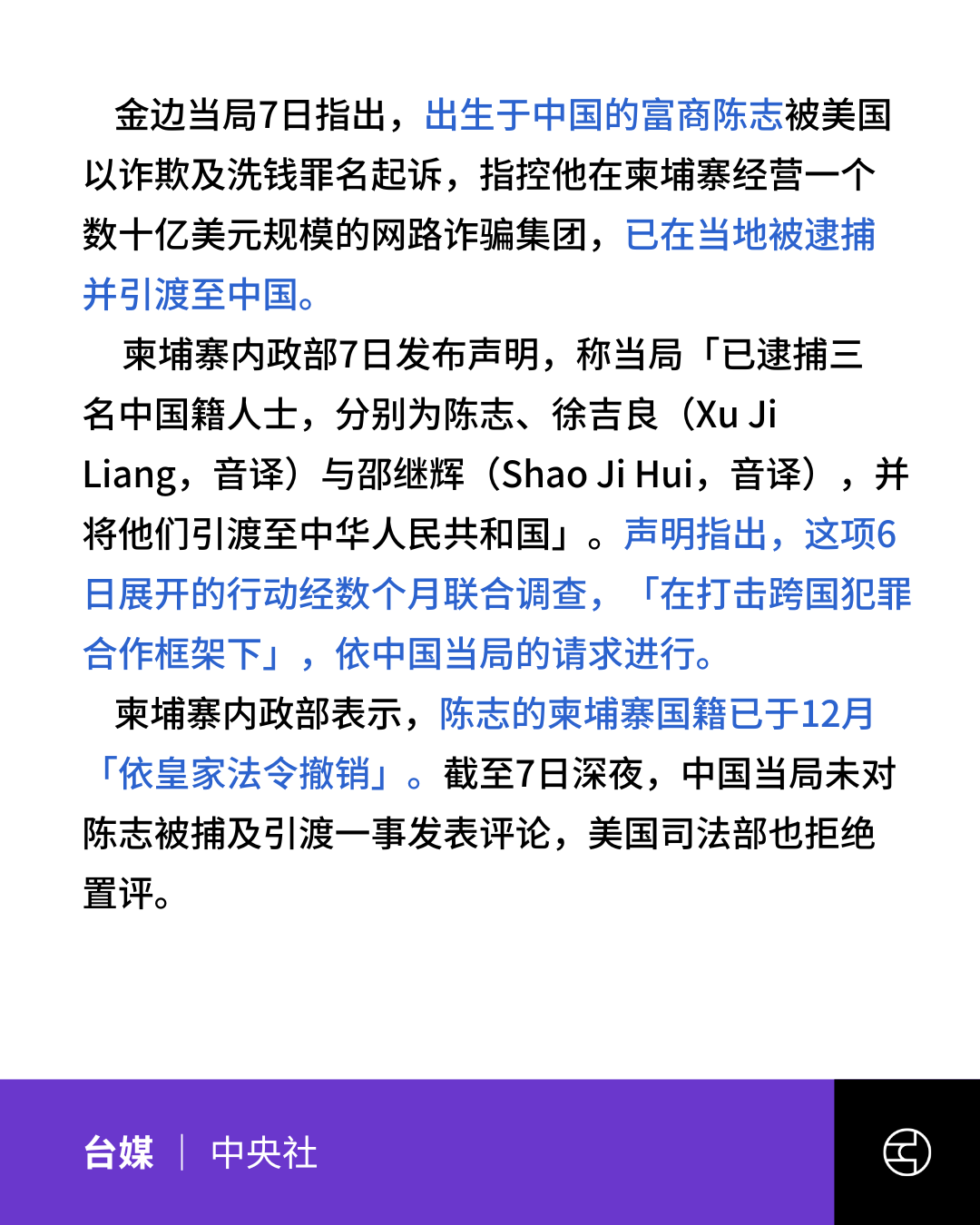 柬埔寨当局证实,去年被美国通缉的跨国网络诈骗集团「太子集团」创办人兼董事长陈志,已在当地被捕并遣返中国。柬方表示,行动是应中方请求展开,并指陈志的柬埔寨国籍已被撤销。