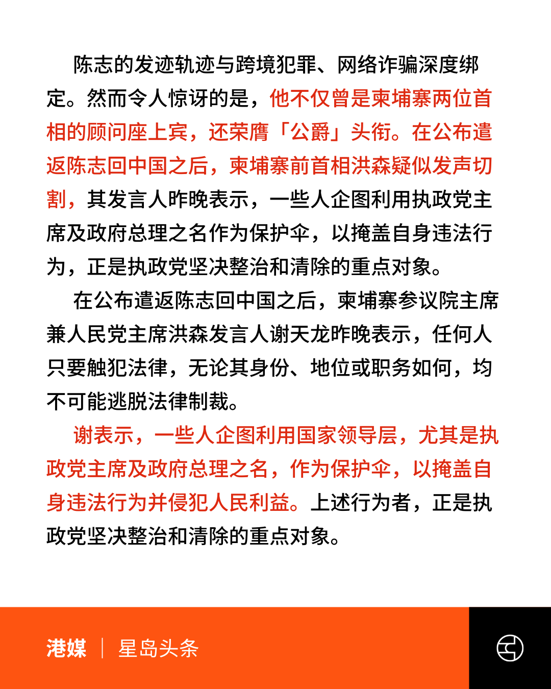 《星岛头条》陈志被捕|闽籍少年柬国发迹获颁公爵洪森疑似发声切割