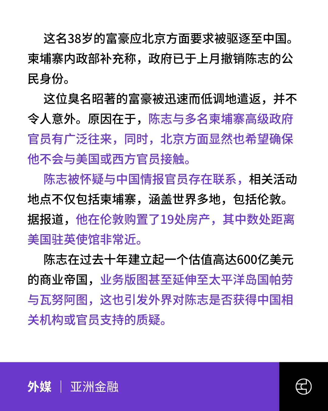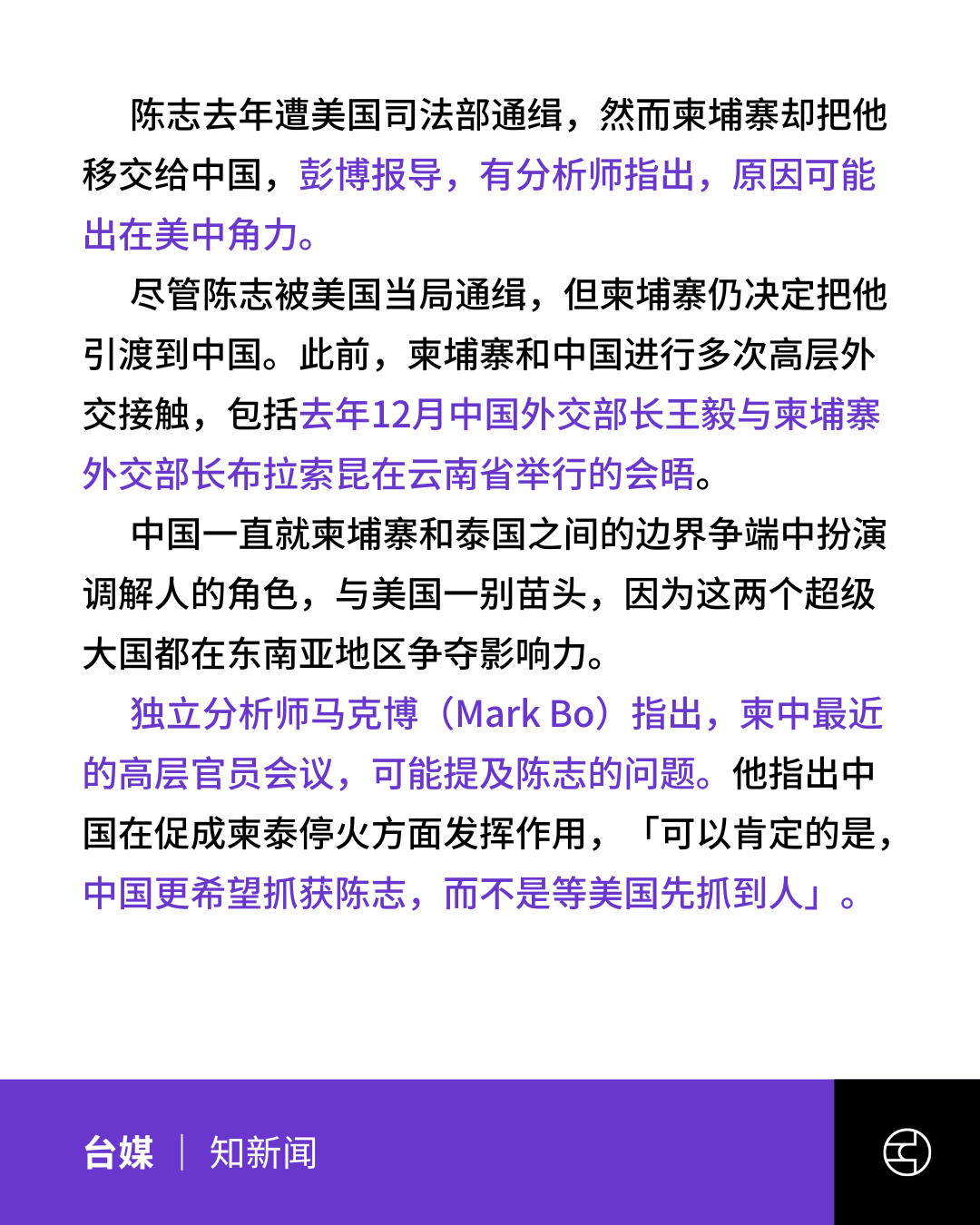 外媒则分析,陈志除与柬埔寨政要往来频繁之外,柬埔寨不选择把他移交美国,而是迅速遣返中国,涉及中美两国的角力和地缘政治的考量,也引用专家称,陈志与中国情报人员有联系,中国希望比美国先抓到陈志。
