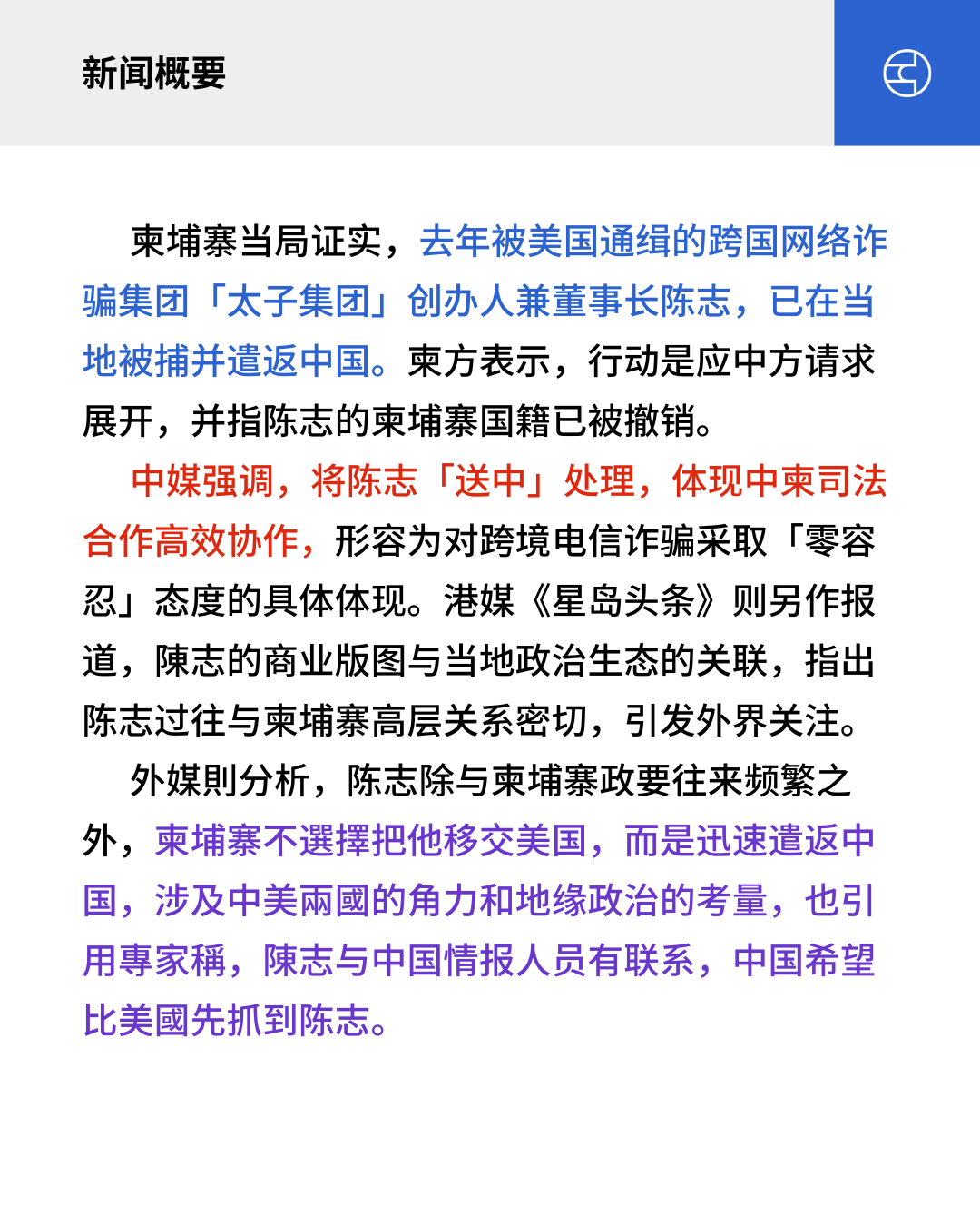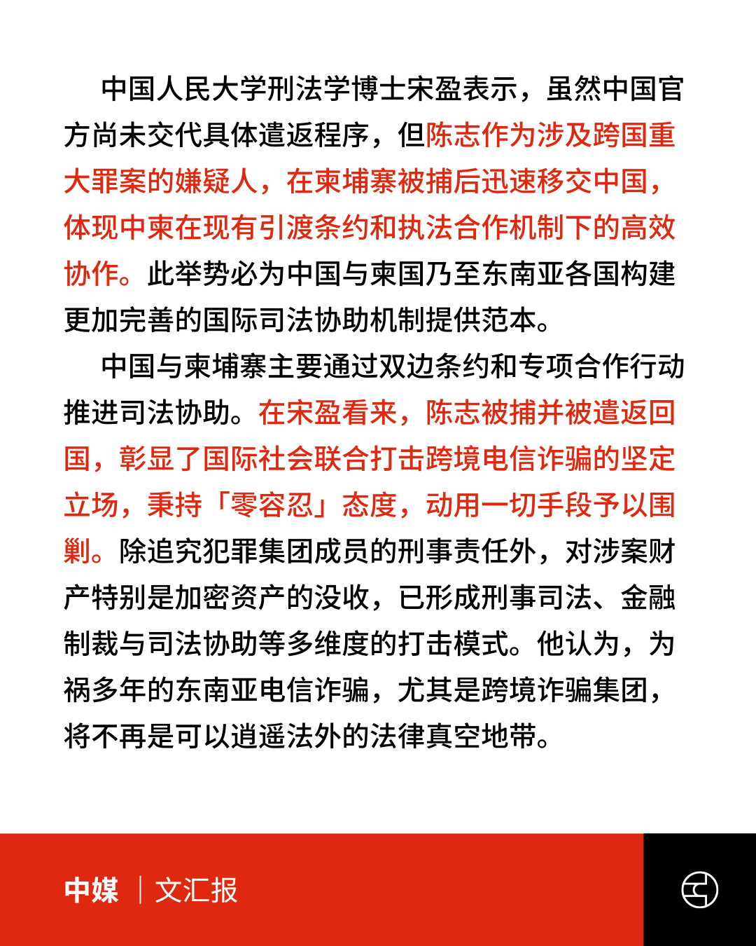 中媒强调,将陈志「送中」处理,体现中柬司法合作高效协作,形容为对跨境电信诈骗采取「零容忍」态度的具体体现。港媒《星岛头条》则另作报道,陈志的商业版图与当地政治生态的关联,指出陈志过往与柬埔寨高层关系密切,引发外界关注。