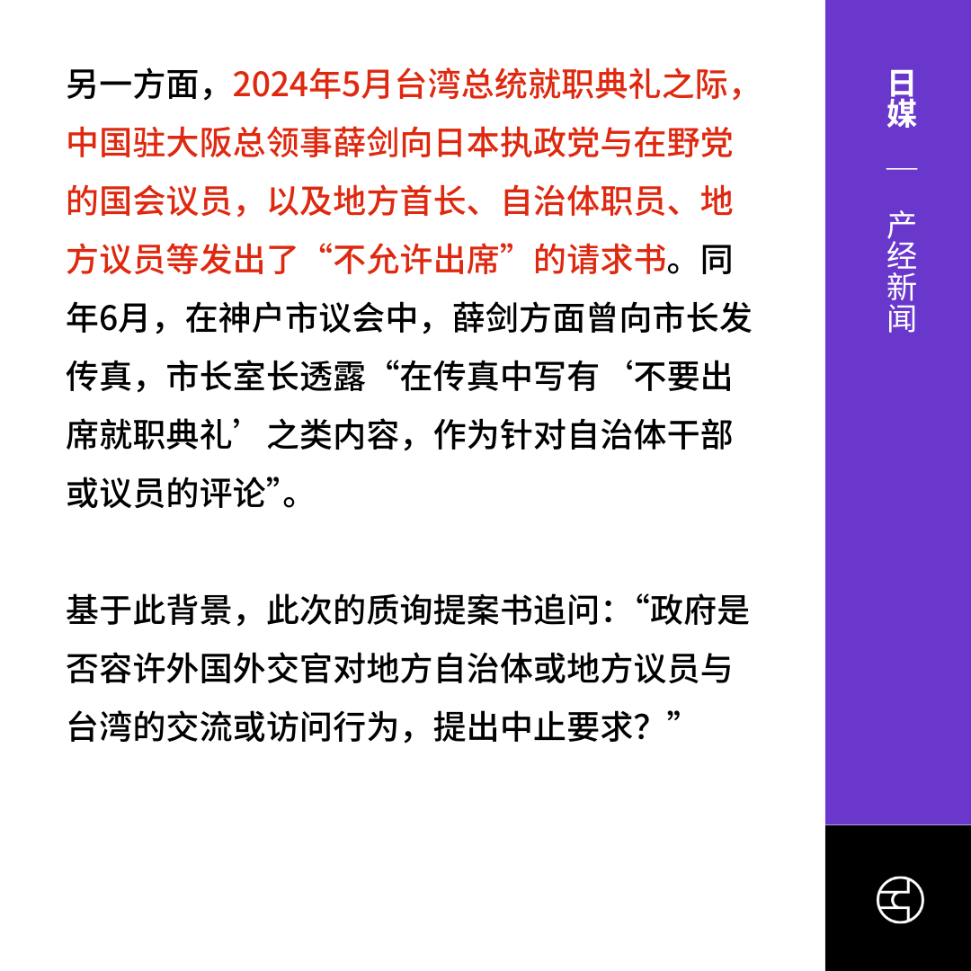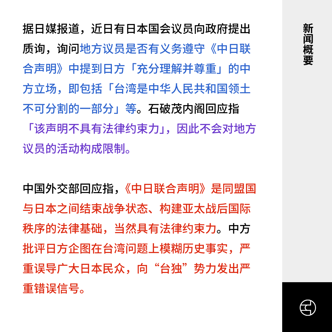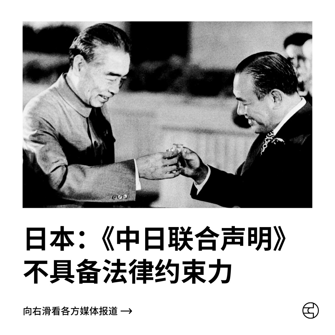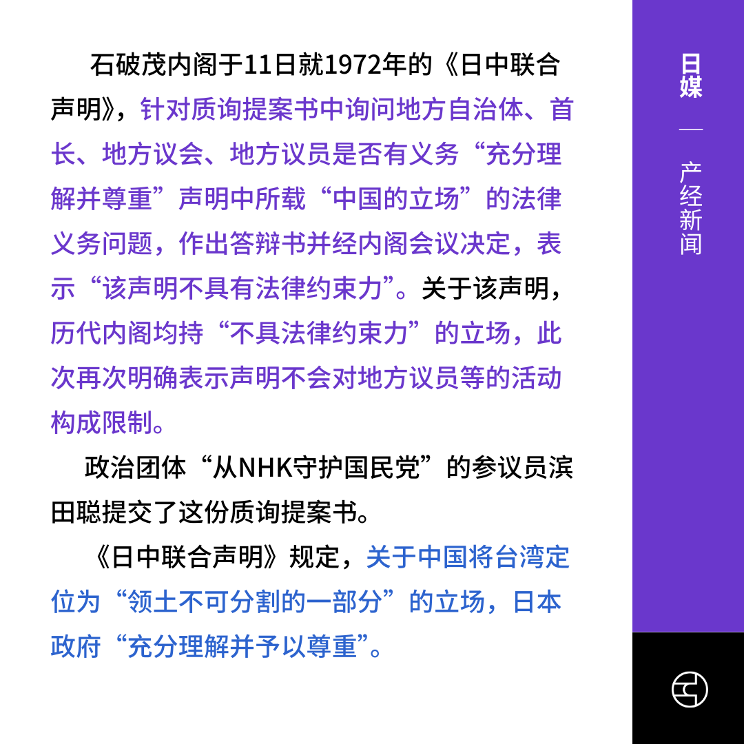 据日媒报道,近日有日本国会议员向政府提出质询,询问地方议员是否有义务遵守《中日联合声明》中提到日方「充分理解并尊重」的中方立场,即包括「台湾是中华人民共和国领土不可分割的一部分」等。石破茂内阁回应指「该声明不具有法律约束力」,因此不会对地方议员的活动构成限制。