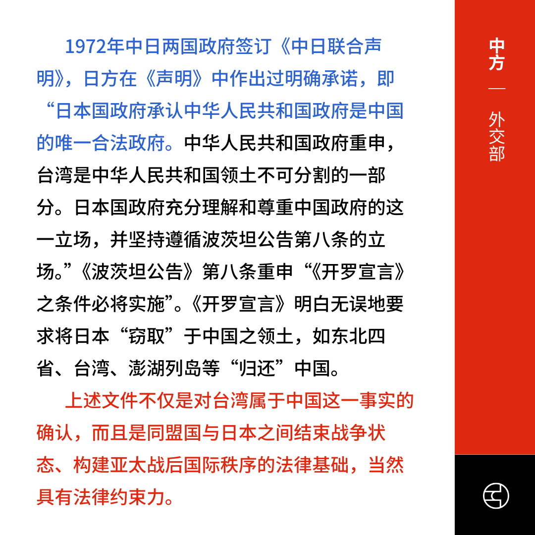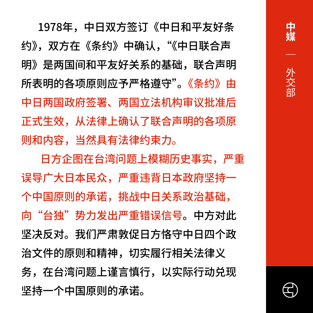 中国外交部回应指,《中日联合声明》是同盟国与日本之间结束战争状态、构建亚太战后国际秩序的法律基础,当然具有法律约束力。中方批评日方企图在台湾问题上模糊历史事实,严重误导广大日本民众,向“台独”势力发出严重错误信号。