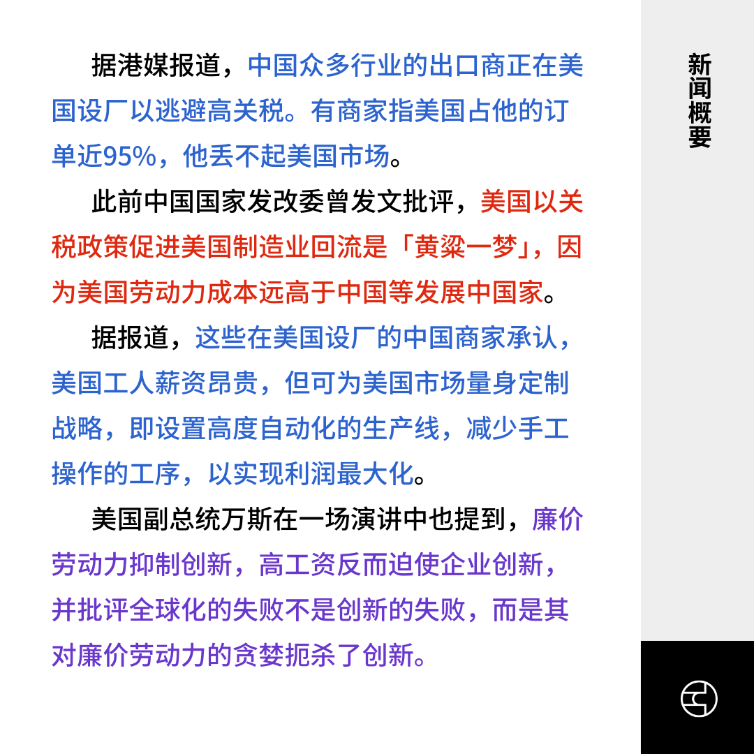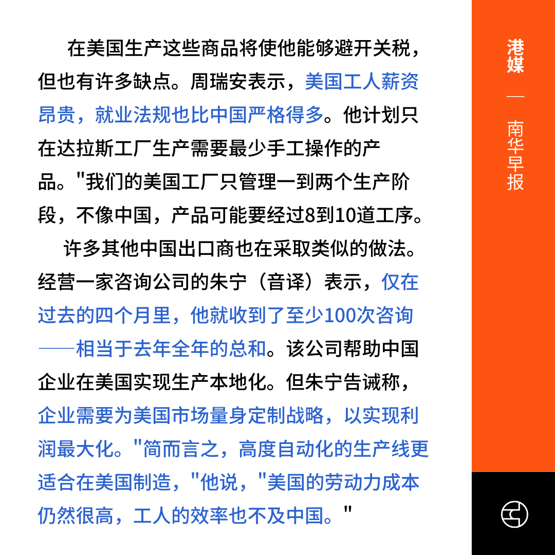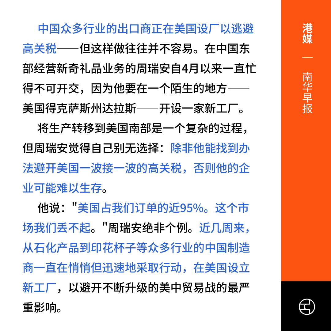 据港媒报道,中国众多行业的出口商正在美国设厂以逃避高关税。有商家指美国占他的订单近95%,他丢不起美国市场。