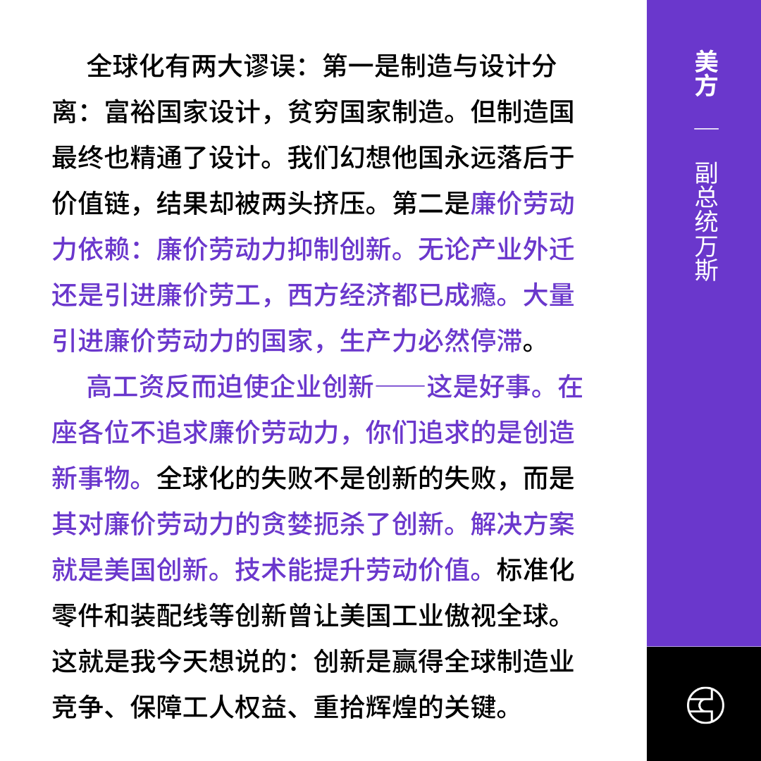 美国副总统万斯在一场演讲中也提到,廉价劳动力抑制创新,高工资反而迫使企业创新,并批评全球化的失败不是创新的失败,而是其对廉价劳动力的贪婪扼杀了创新。