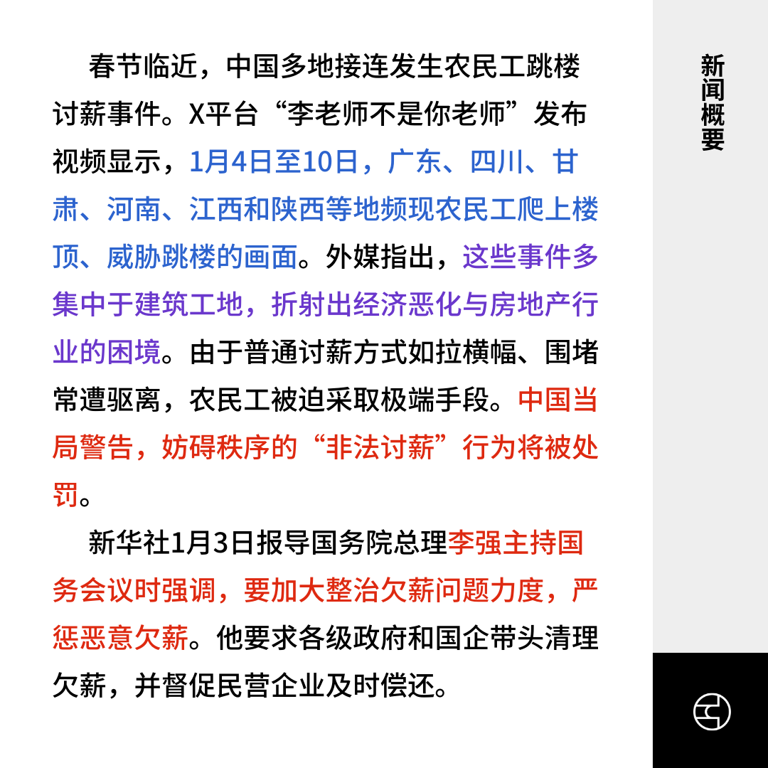 春节临近,中国多地接连发生农民工跳楼讨薪事件。X平台“李老师不是你老师”发布视频显示,1月4日至10日,广东、四川、甘肃、河南、江西和陕西等地频现农民工爬上楼顶、威胁跳楼的画面。外媒指出,这些事件多集中于建筑工地,折射出经济恶化与房地产行业的困境。由于普通讨薪方式如拉横幅、围堵常遭驱离,农民工被迫采取极端手段。中国当局警告,妨碍秩序的“非法讨薪”行为将被处罚。