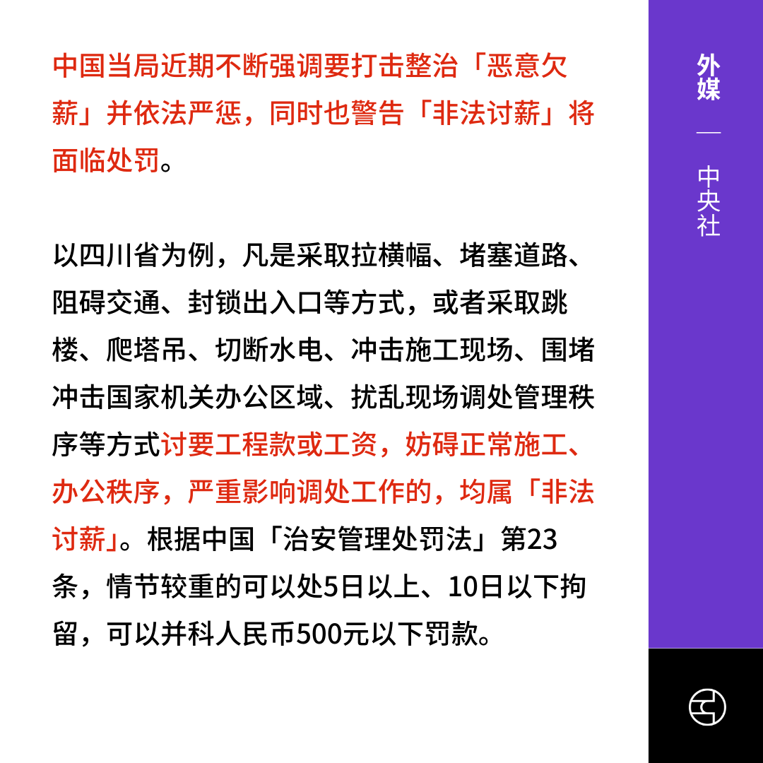 国务院强调清理欠薪刻不容缓。当局警告“非法讨薪”行为,至少行政拘留5天。