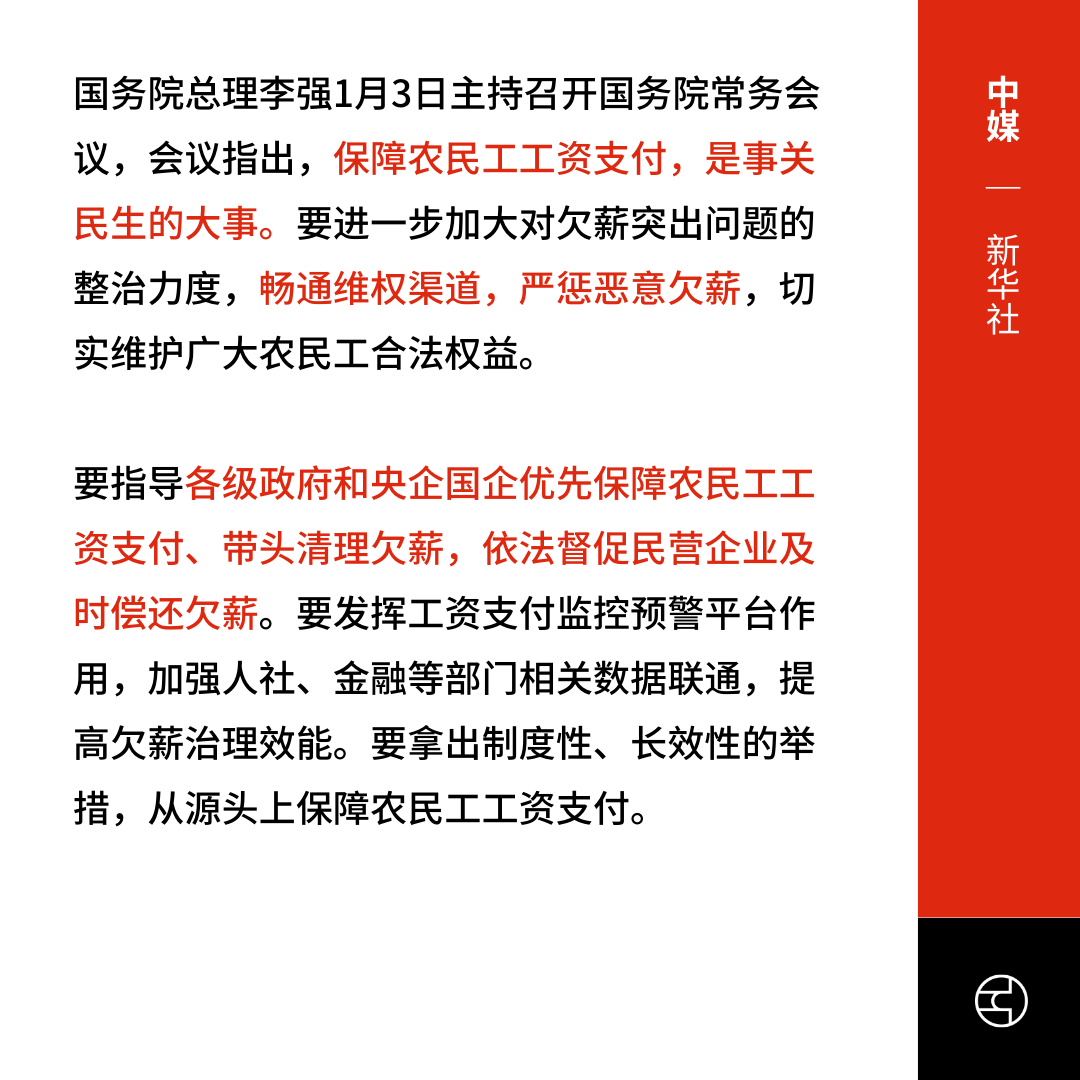 新华社1月3日报导国务院总理李强主持国务会议时强调,要加大整治欠薪问题力度,严惩恶意欠薪。他要求各级政府和国企带头清理欠薪,并督促民营企业及时偿还。