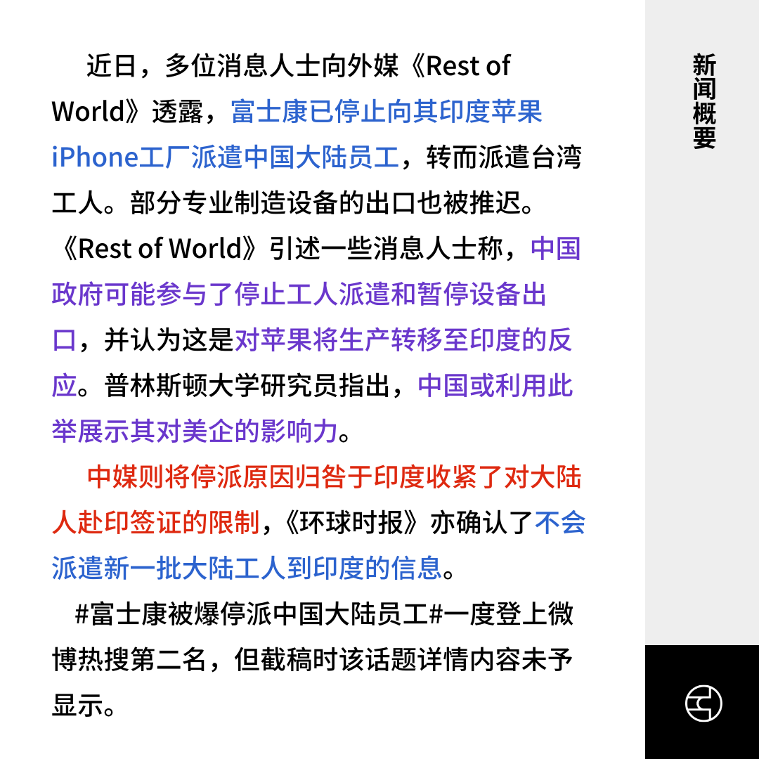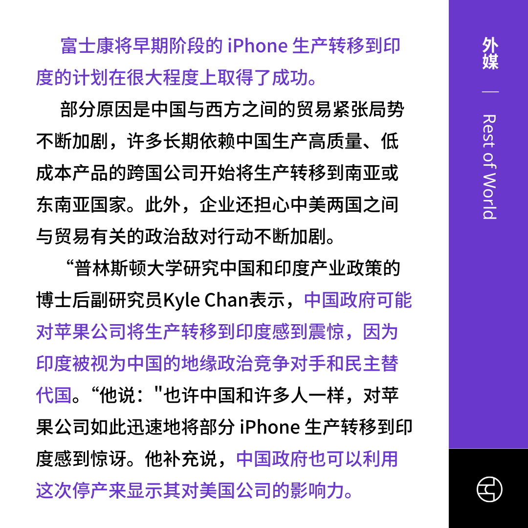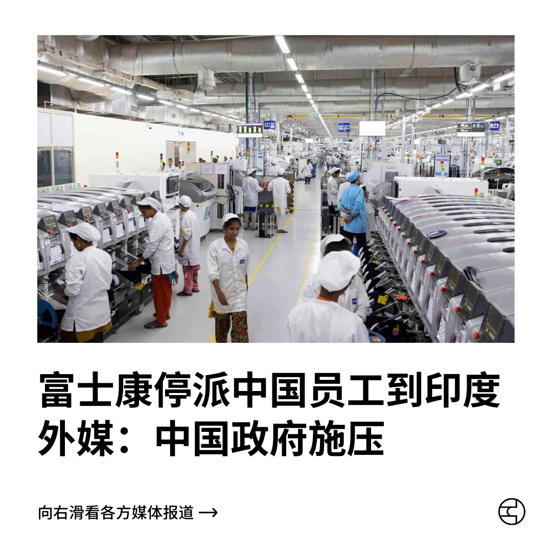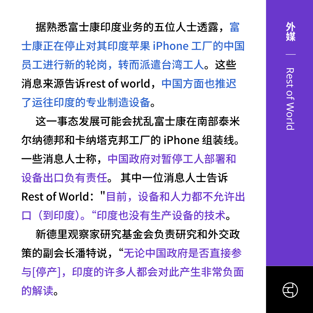 近日,多位消息人士向外媒《Rest of World》透露,富士康已停止向其印度苹果iPhone工厂派遣中国大陆员工,转而派遣台湾工人。部分专业制造设备的出口也被推迟。《Rest of World》引述一些消息人士称,中国政府可能参与了停止工人派遣和暂停设备出口,并认为这是对苹果将生产转移至印度的反应。普林斯顿大学研究员指出,中国或利用此举展示其对美企的影响力。