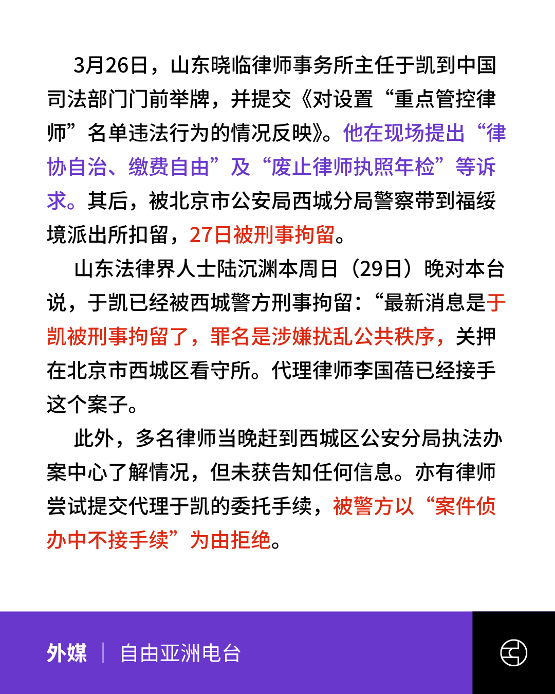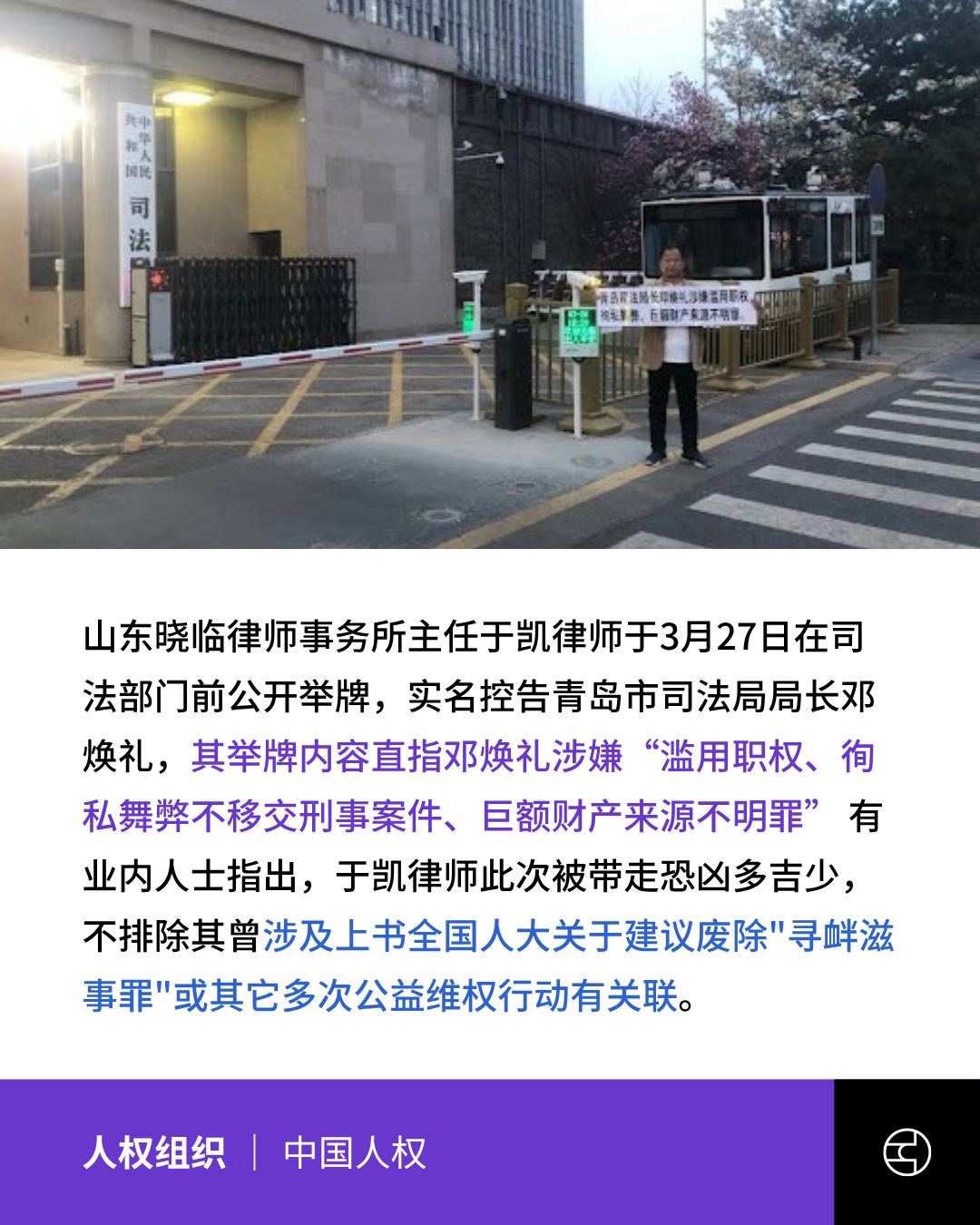山东律师于凯3月26日到司法部门门前举牌,提交《对设置”重点管控律师”名单违法行为的情况反映》,诉求包括”律协自治”和”废止律师执照年检”,同时实名控告青岛司法局长,涉嫌徇私舞弊不移交刑事案件及巨额财产来源不明。次日被北京西城警方以”涉嫌扰乱公共秩序罪”刑事拘留,关押于西城区看守所。