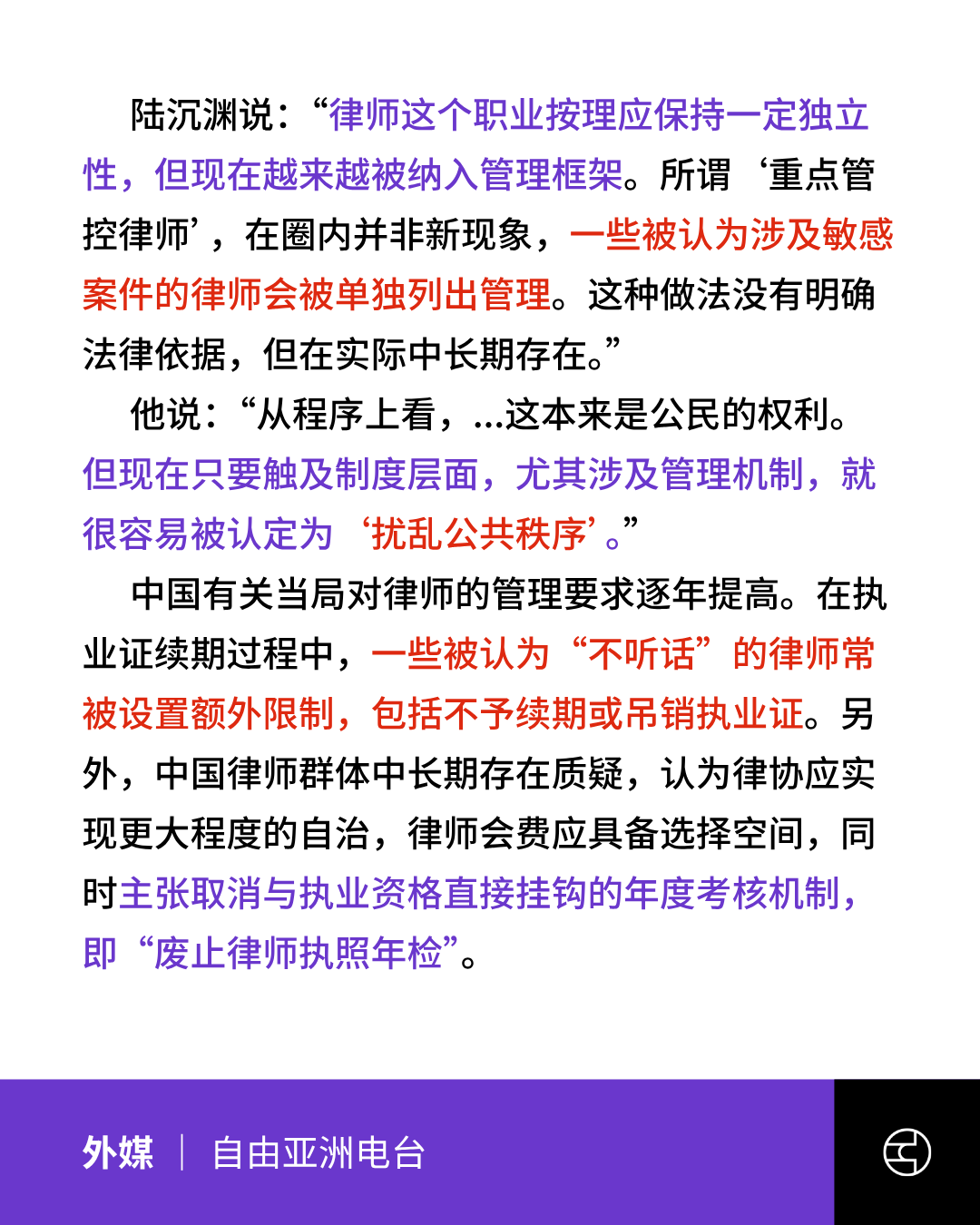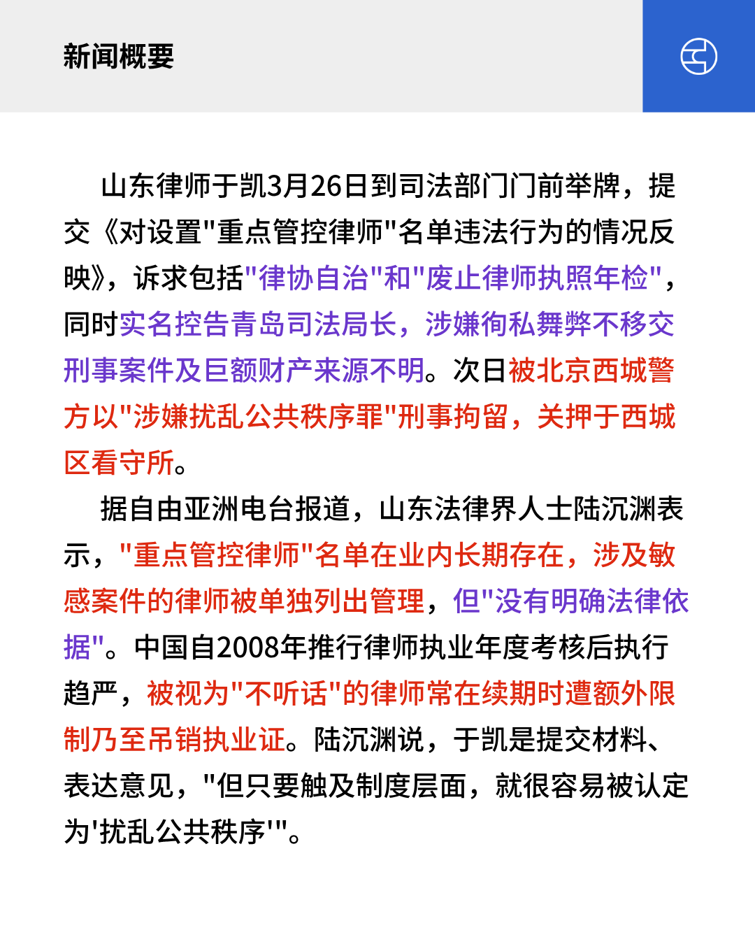 据自由亚洲电台报道,山东法律界人士陆沉渊表示,”重点管控律师”名单在业内长期存在,涉及敏感案件的律师被单独列出管理,但”没有明确法律依据”。中国自2008年推行律师执业年度考核后执行趋严,被视为”不听话”的律师常在续期时遭额外限制乃至吊销执业证。陆沉渊说,于凯是提交材料、表达意见,”但只要触及制度层面,就很容易被认定为’扰乱公共秩序’”。