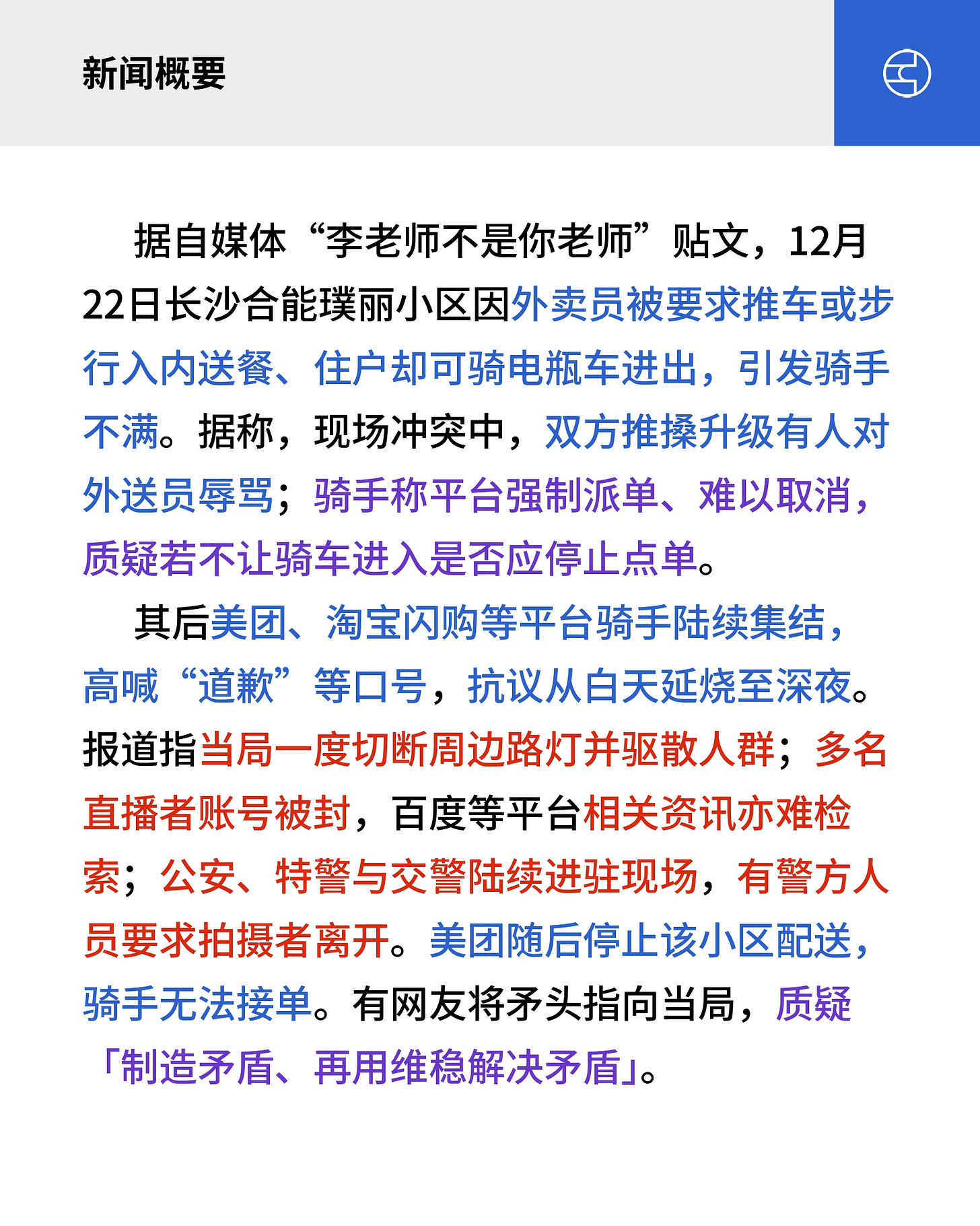 据自媒体“李老师不是你老师”贴文,12月22日长沙合能璞丽小区因外卖员被要求推车或步行入内送餐、住户却可骑电瓶车进出,引发骑手不满。据称,现场冲突中,双方推搡升级有人对外送员辱骂;骑手称平台强制派单、难以取消,质疑若不让骑车进入是否应停止点单。