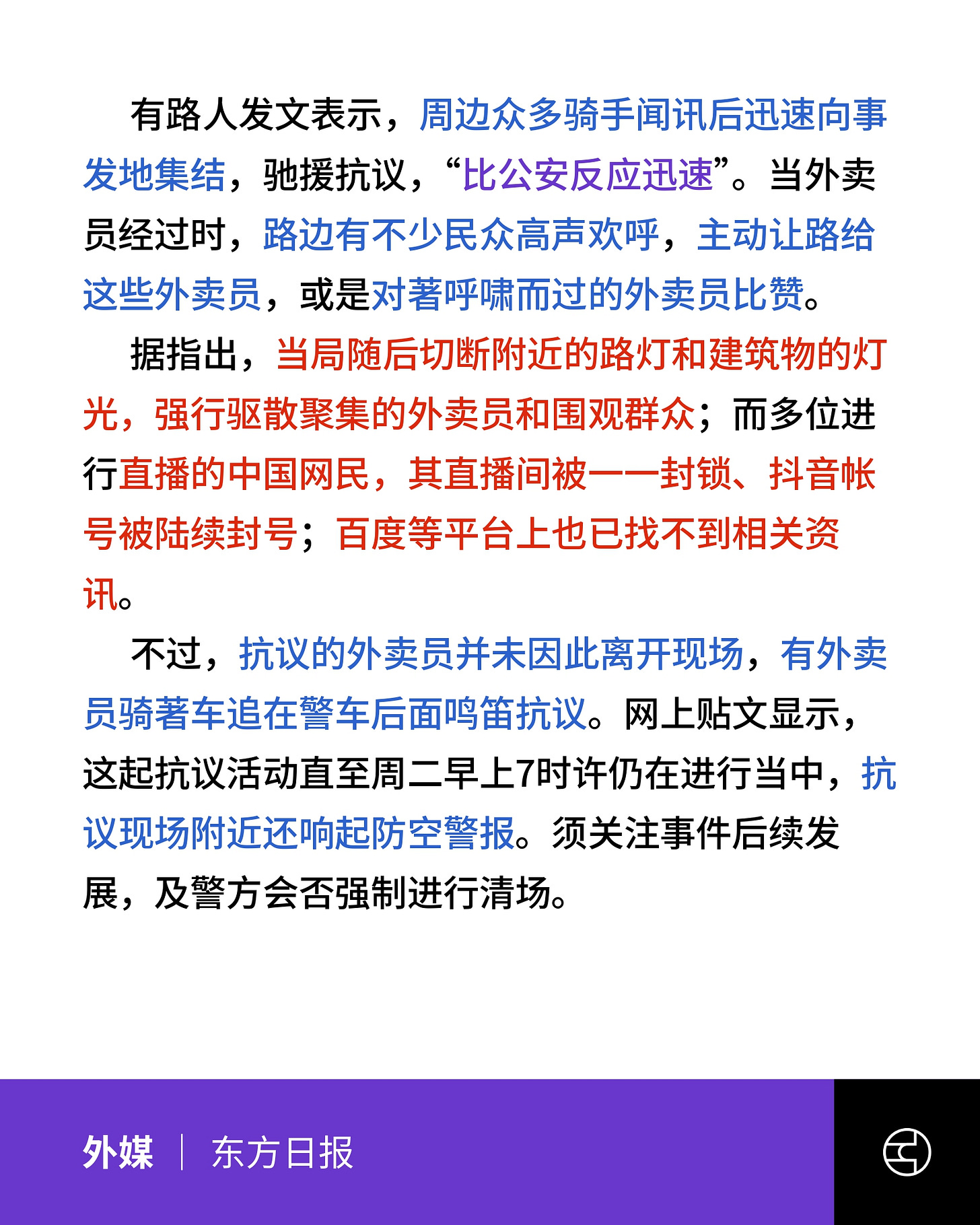 《东方日报》中国长沙爆发外卖员大规模抗争 事件延烧至周二早上