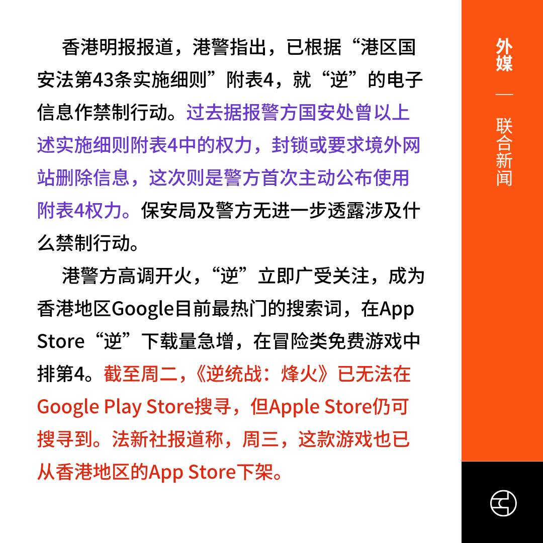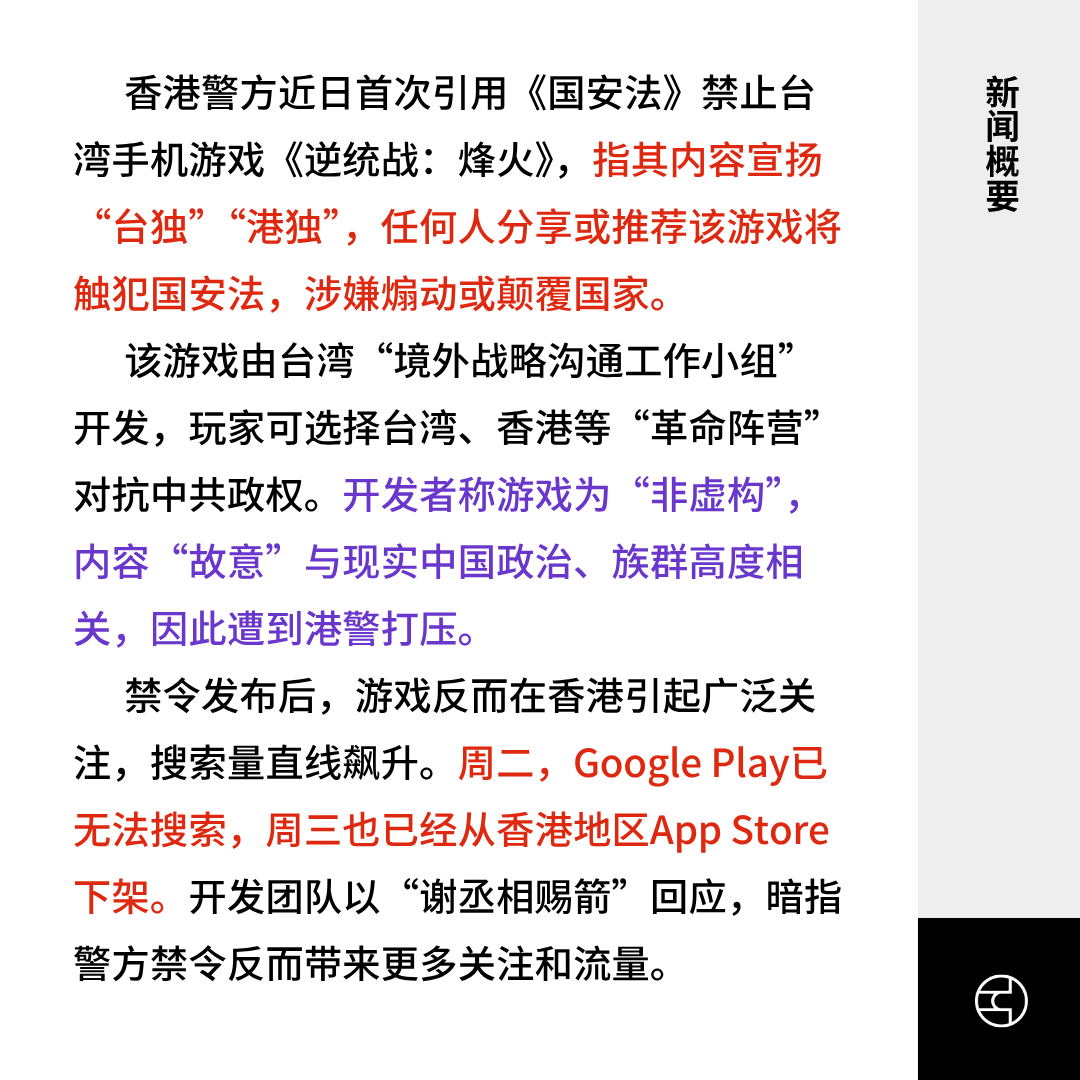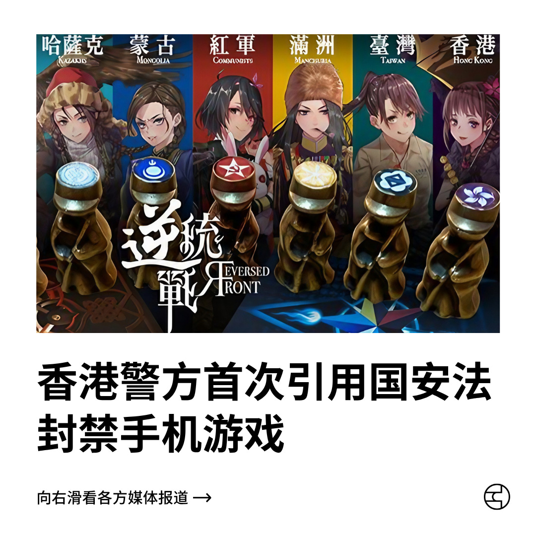 香港警方近日首次引用《国安法》禁止台湾手机游戏《逆统战:烽火》,指其内容宣扬“台独”“港独”,任何人分享或推荐该游戏将触犯国安法,涉嫌煽动或颠覆国家。
