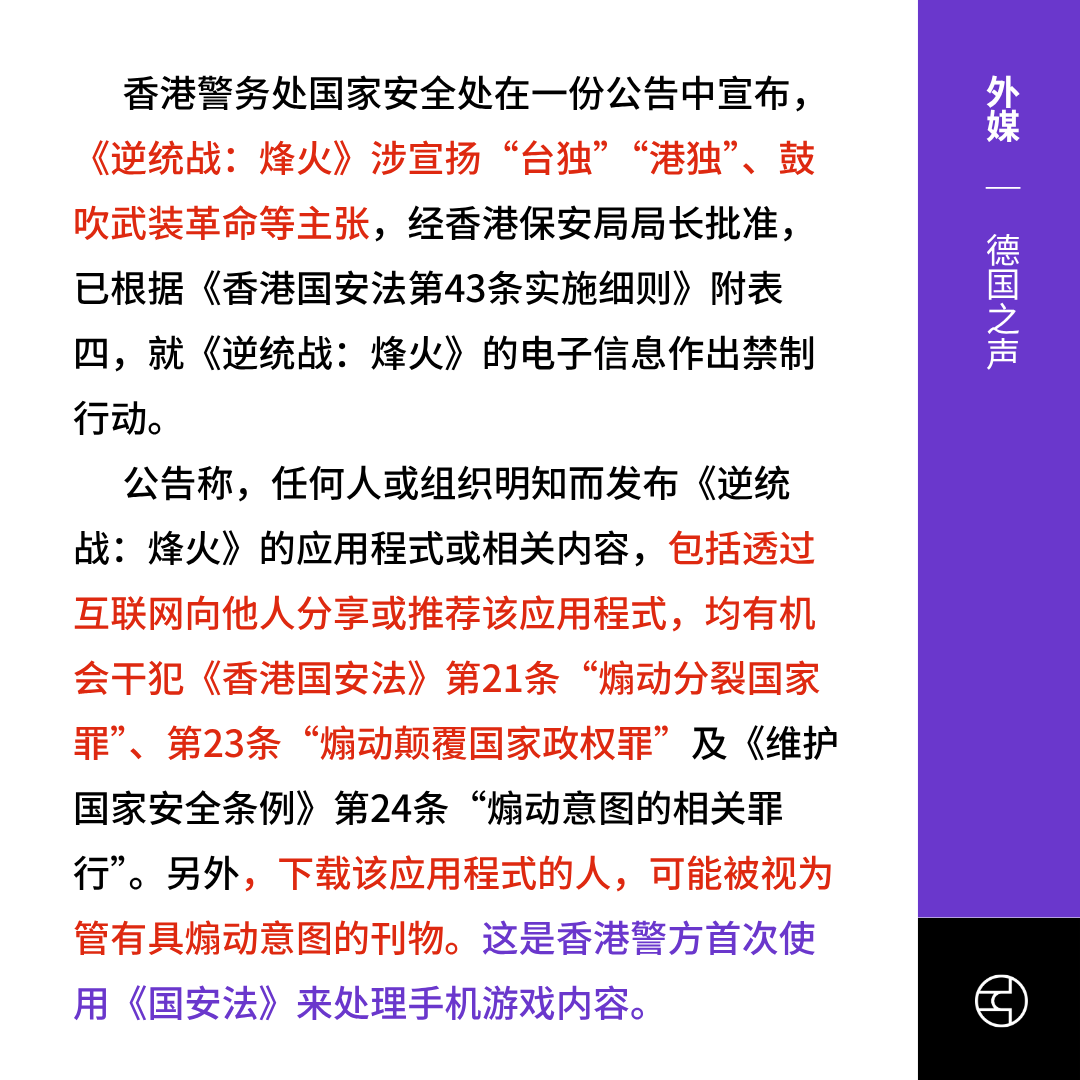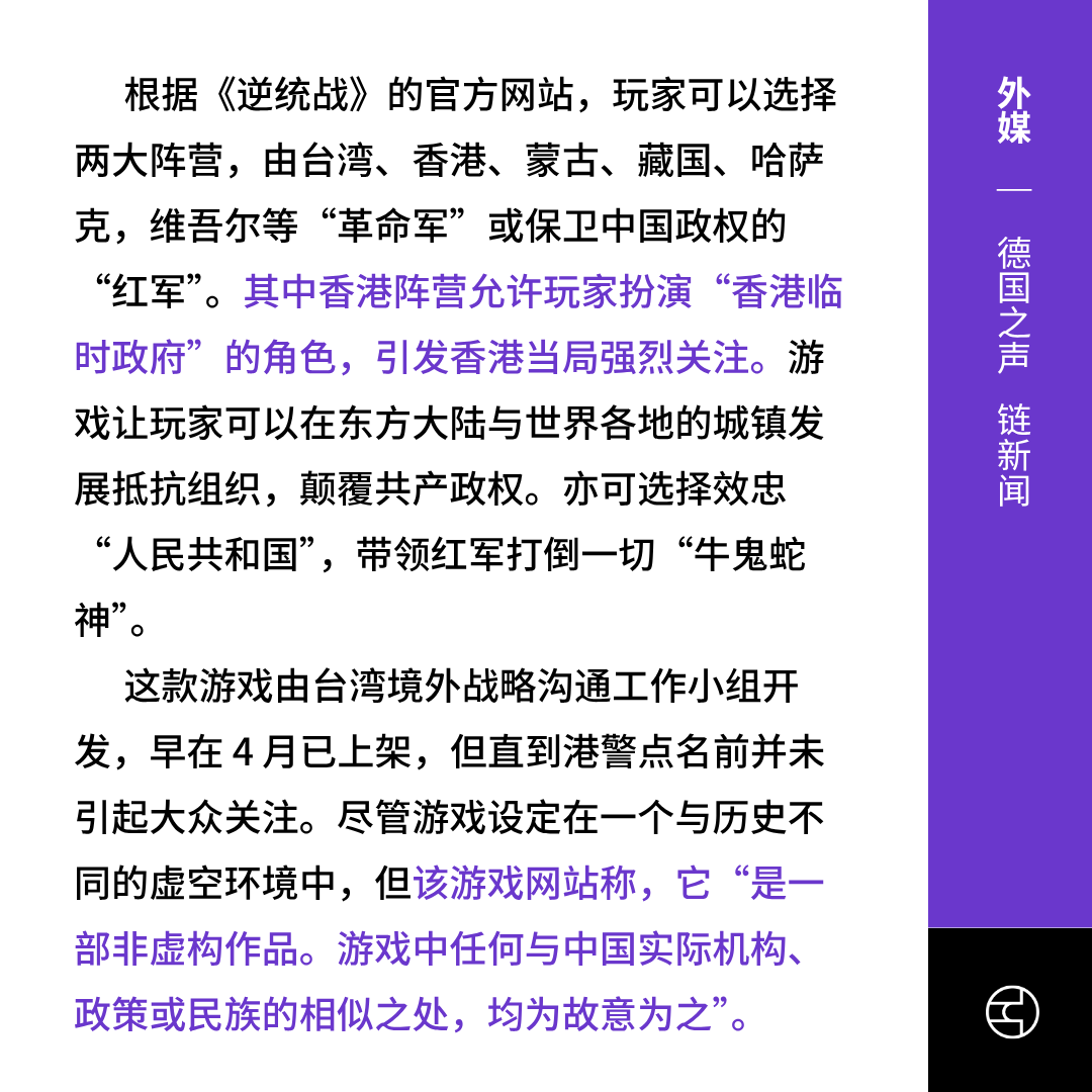 《德国之声》香港引用《国安法》禁止台湾手游《逆统战:烽火》