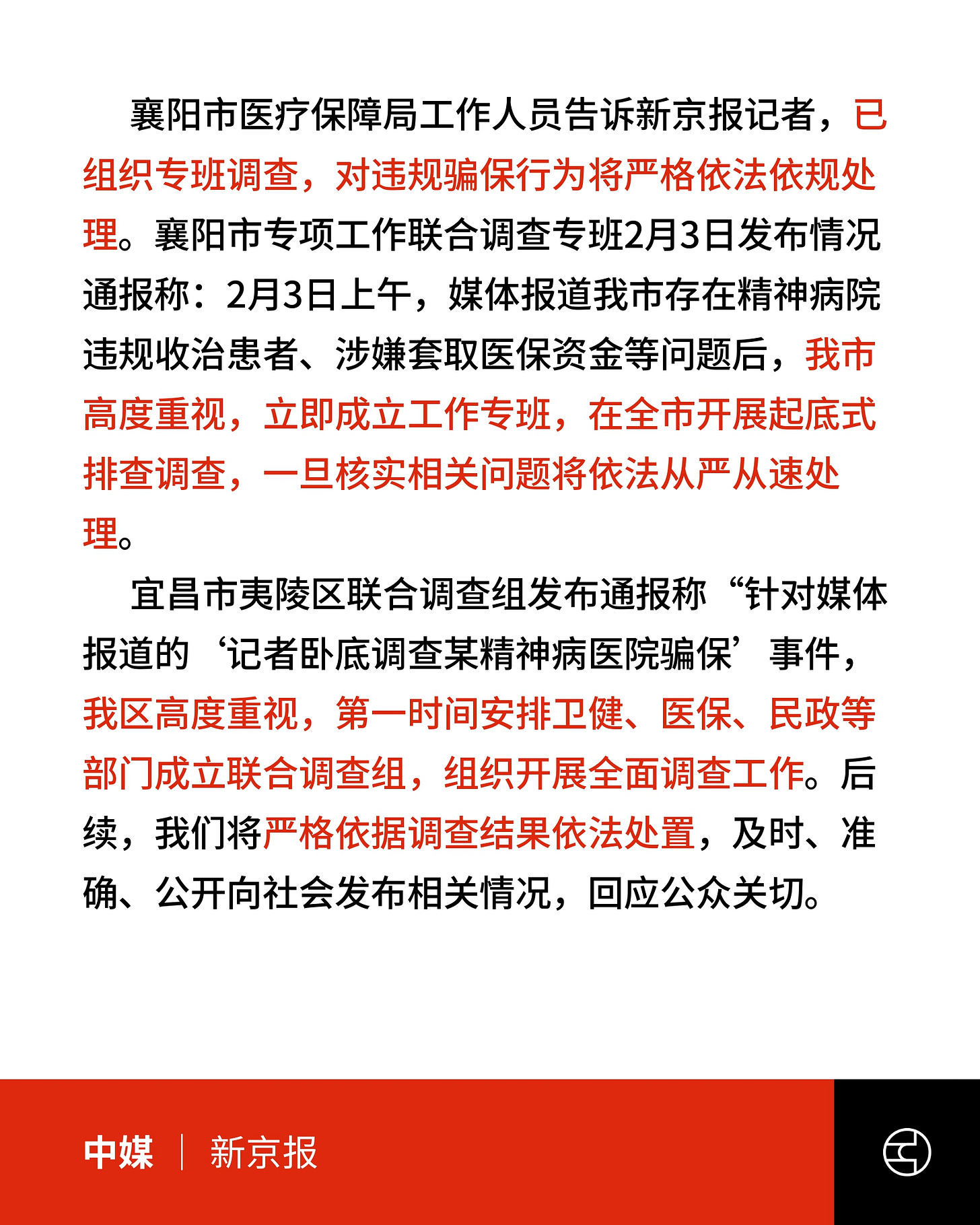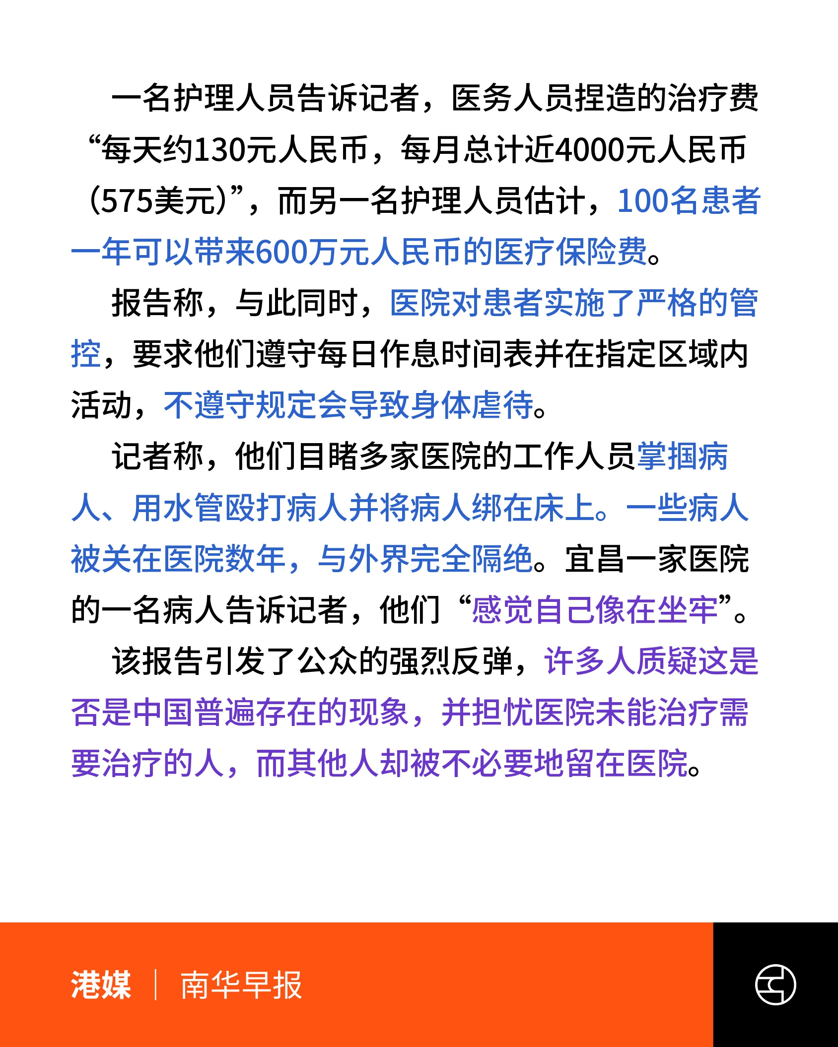 报导指出,医护人员通过虚构诊疗项目、延长住院时间套取医保资金。部分医院还通过“假出院”等方式规避检查,甚至教唆家属报假警以阻止患者出院。报导提到,院内存在严格管控与体罚情形,包括捆绑、殴打及强迫劳动。一些病人长期与外界隔绝,形容住院“如同坐牢”。事件曝光后,引发社会关注与质疑。襄阳、宜昌当地政府表示已成立联合调查组,展开全面排查。