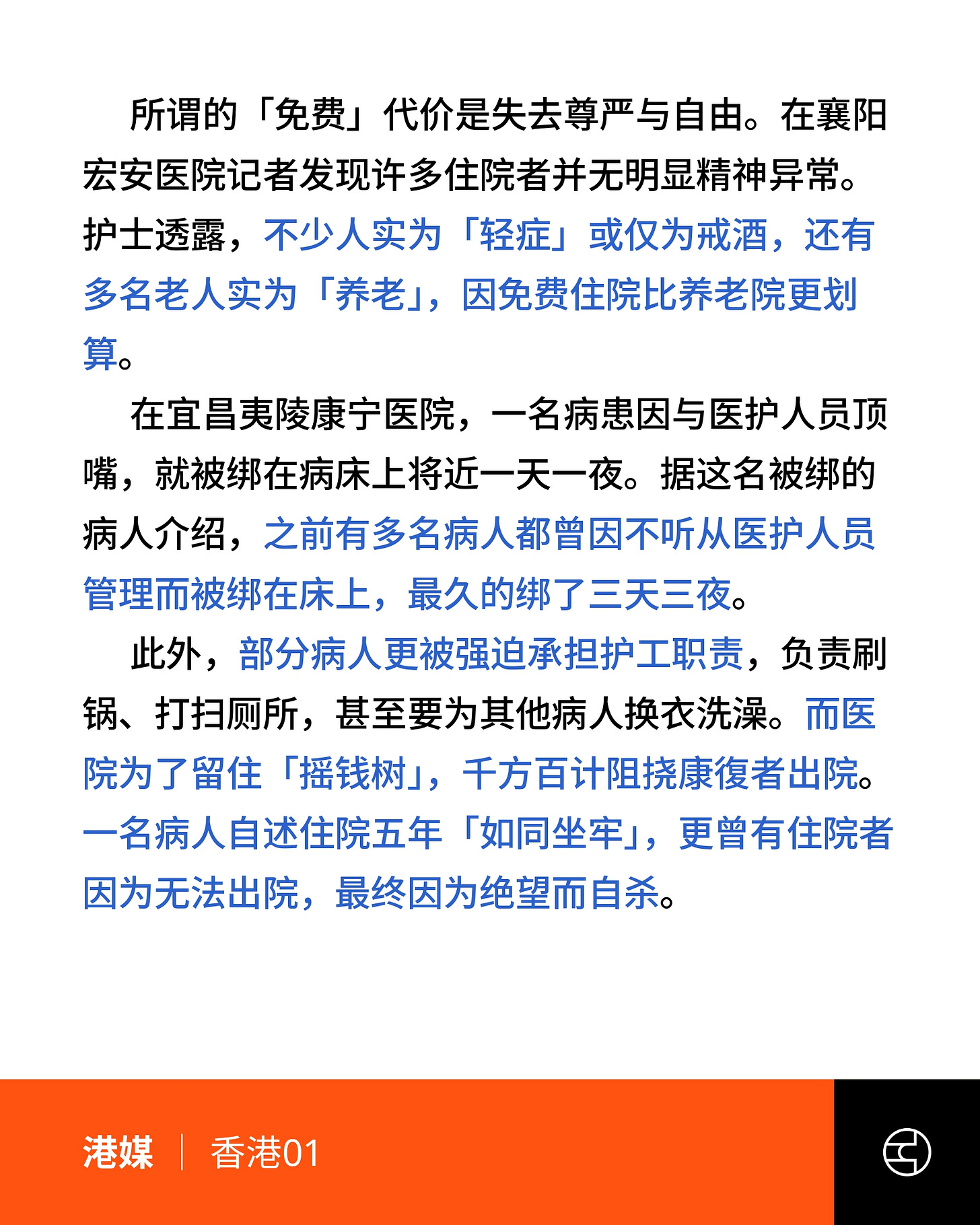 《香港01》湖北多家精神病院禁锢无病者呃医保 病患沦奴隶有人无法出院轻生