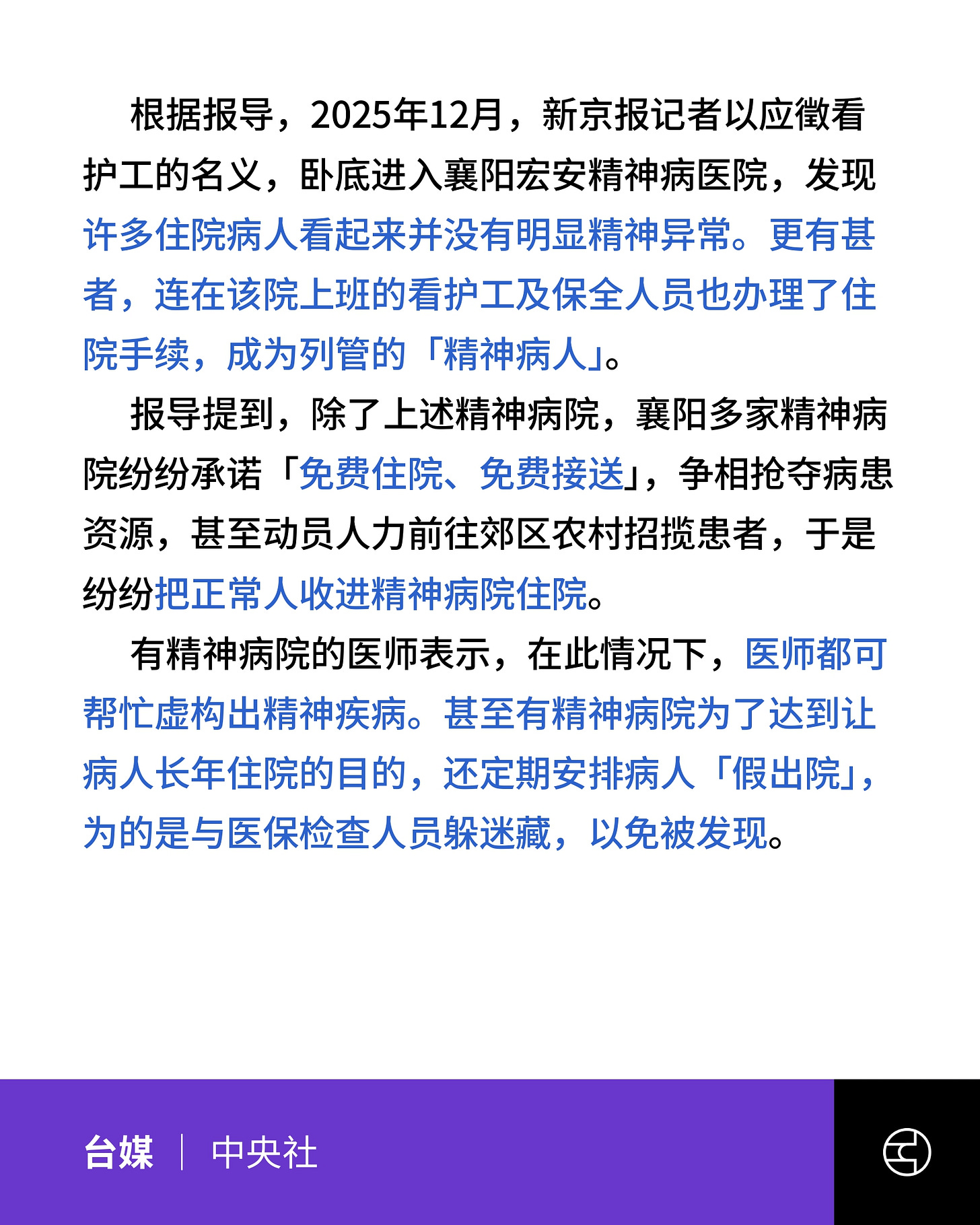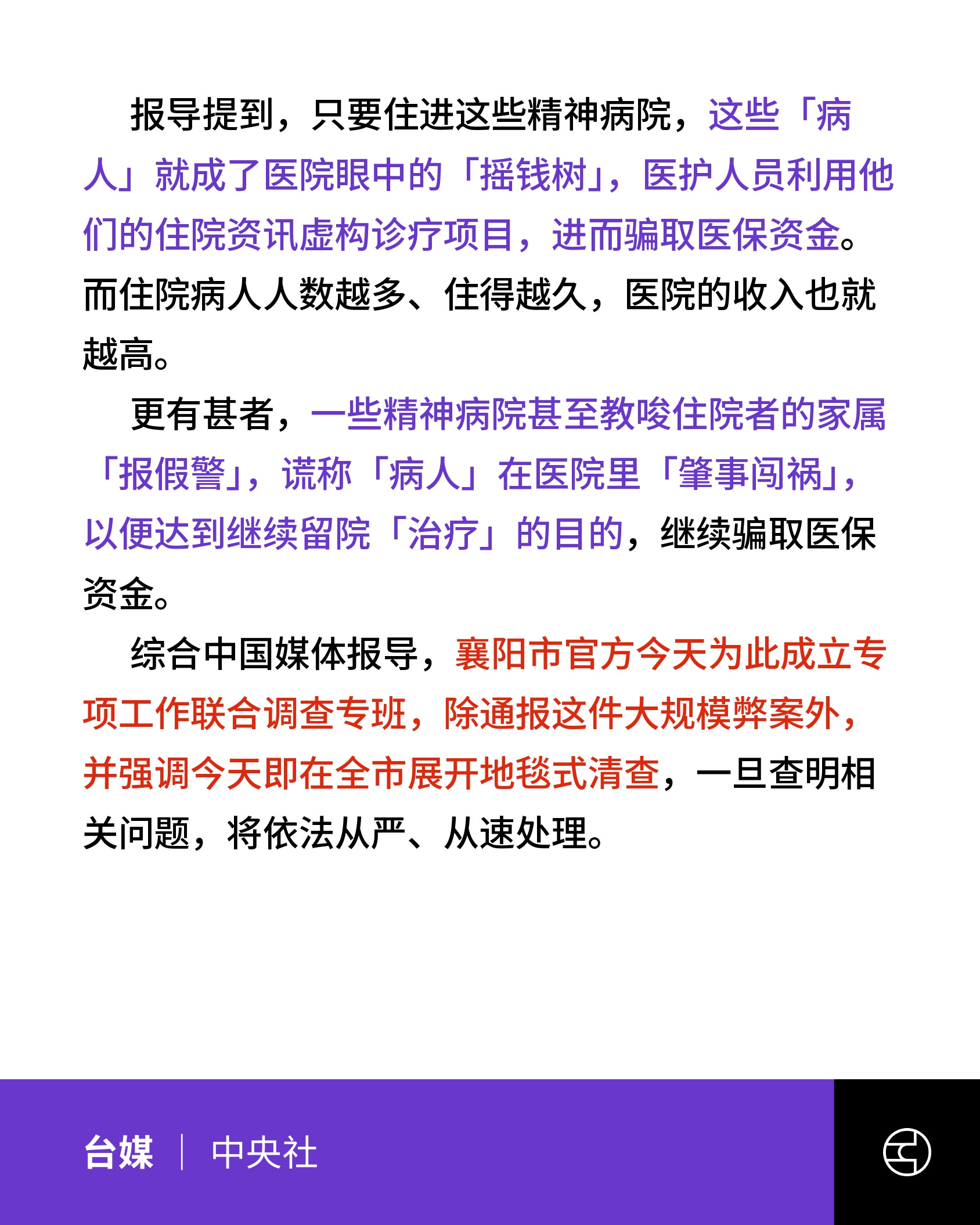 《中央社》湖北襄阳多家精神病院招揽正常人住院 骗取医保经费