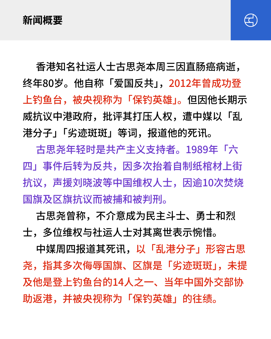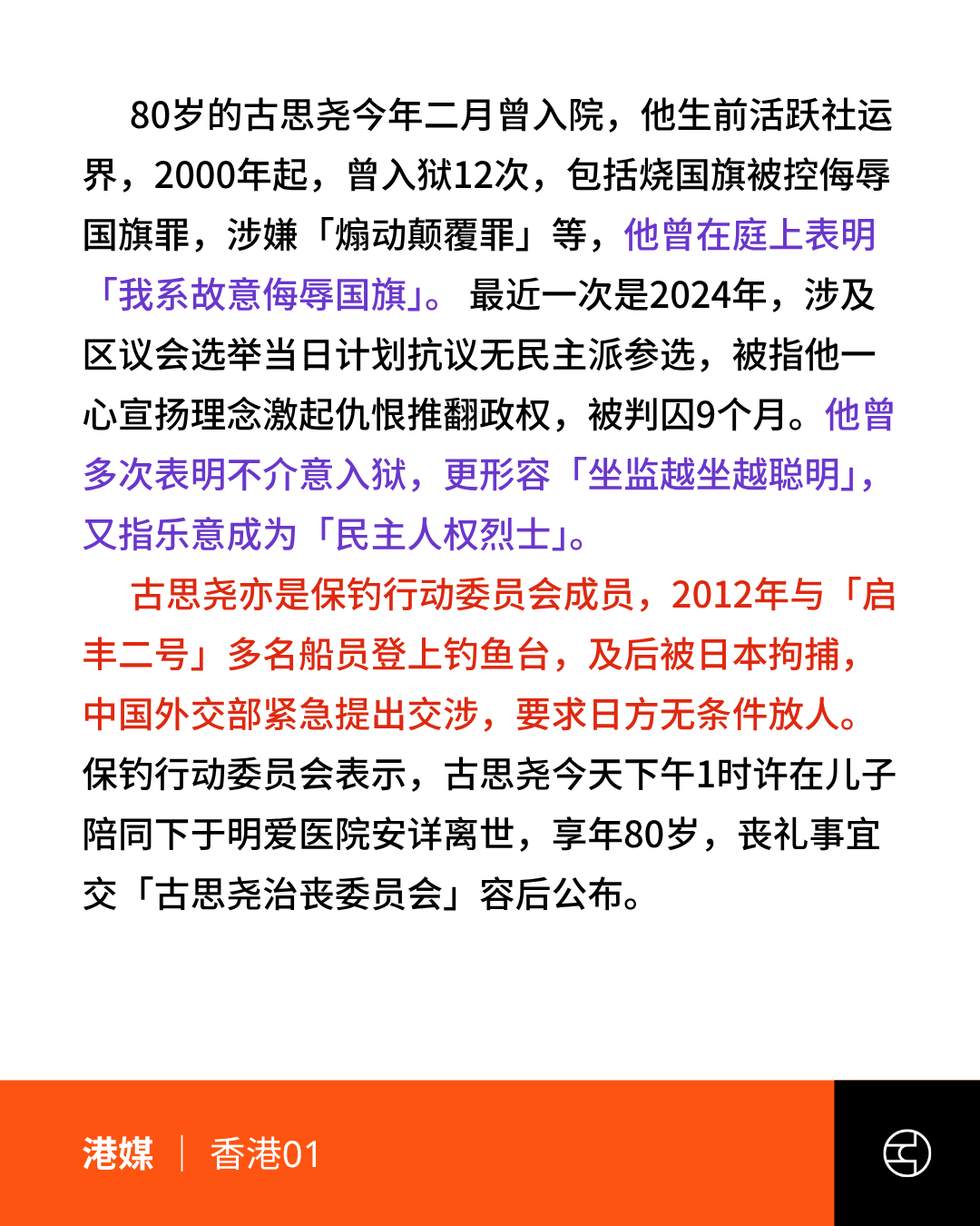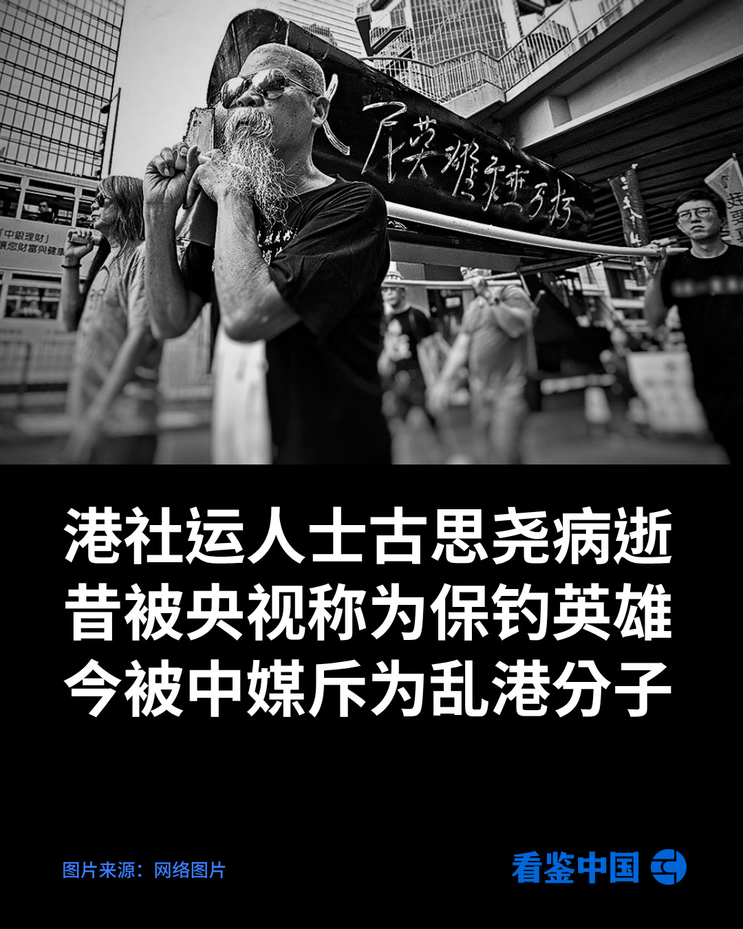香港知名社运人士古思尧本周三因直肠癌病逝,终年80岁。他自称「爱国反共」,2012年曾成功登上钓鱼台,被央视称为「保钓英雄」。但因他长期示威抗议中港政府,批评其打压人权,遭中媒以「乱港分子」「劣迹斑斑」等词,报道他的死讯。