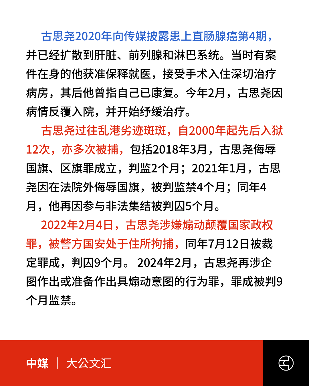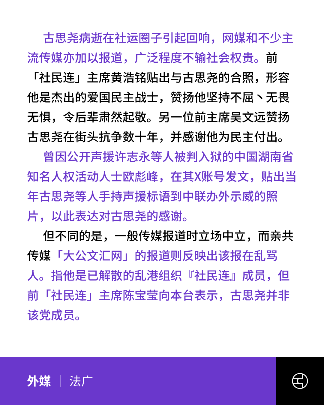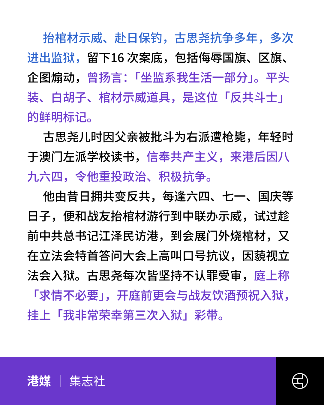 香港知名社运人士古思尧本周三因直肠癌病逝,终年80岁。他自称「爱国反共」,2012年曾成功登上钓鱼台,被央视称为「保钓英雄」。但因他长期示威抗议中港政府,批评其打压人权,遭中媒以「乱港分子」「劣迹斑斑」等词,报道他的死讯。