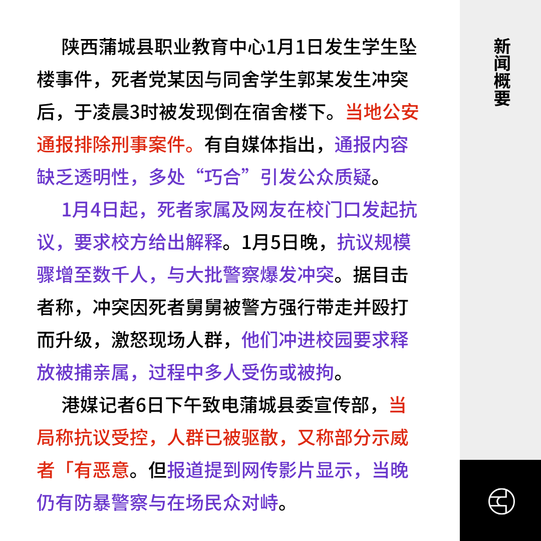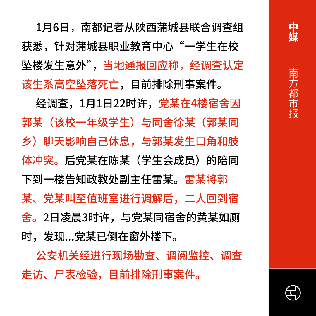 陕西蒲城县职业教育中心1月1日发生学生坠楼事件,死者党某因与同舍学生郭某发生冲突后,于凌晨3时被发现倒在宿舍楼下。当地公安通报排除刑事案件。有自媒体指出,通报内容缺乏透明性,多处“巧合”引发公众质疑。