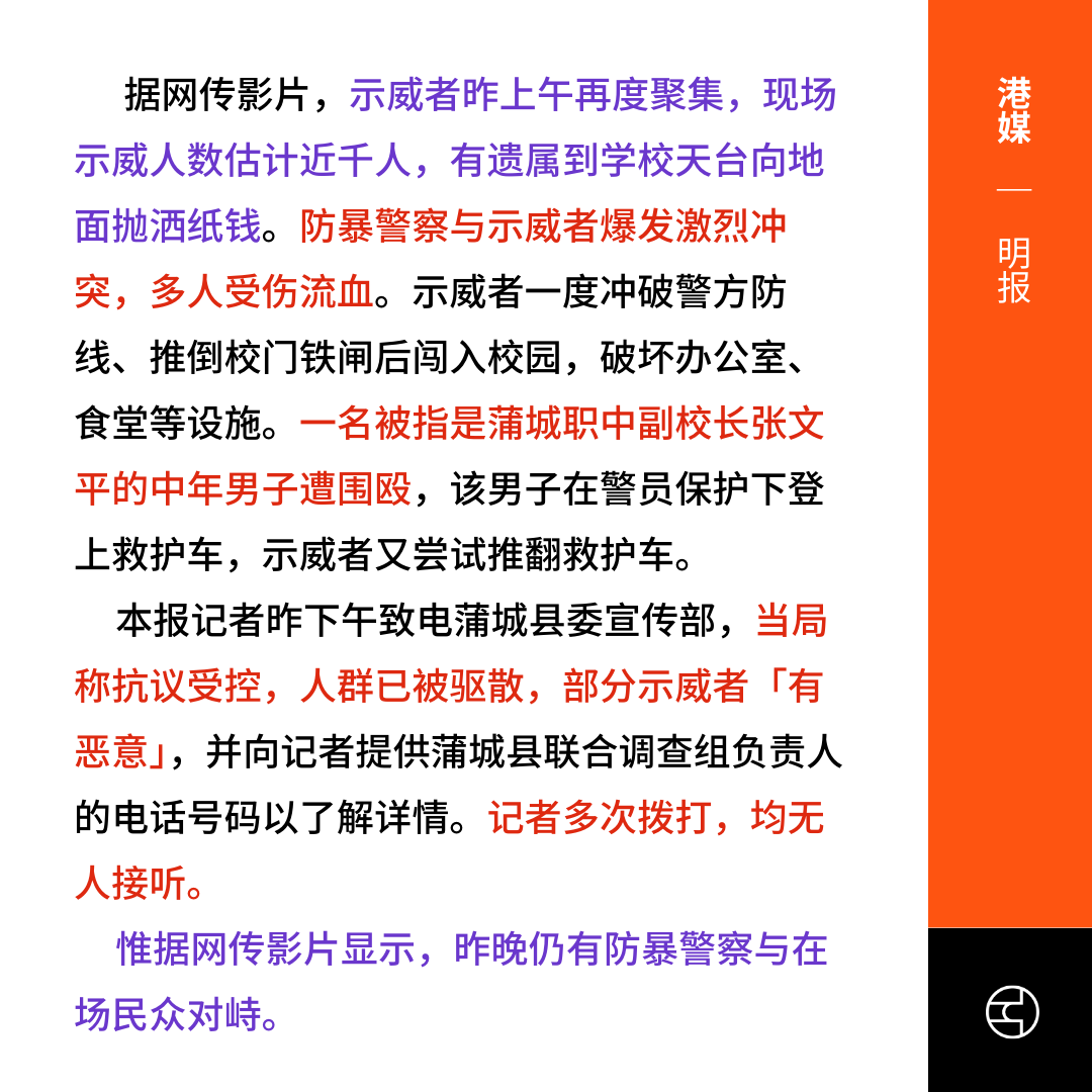 港媒记者6日下午致电蒲城县委宣传部,当局称抗议受控,人群已被驱散,又称部分示威者「有恶意。但报道提到网传影片显示,当晚仍有防暴警察与在场民众对峙。