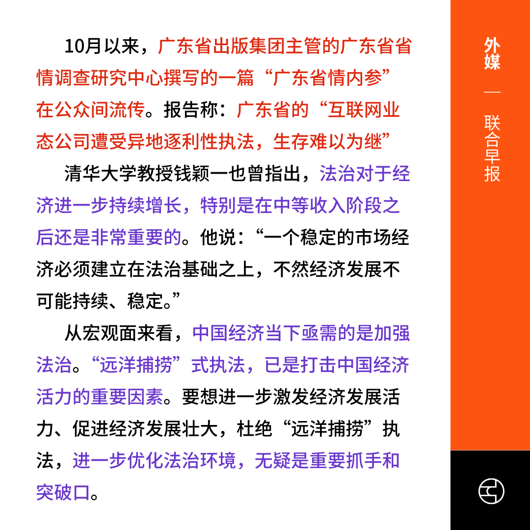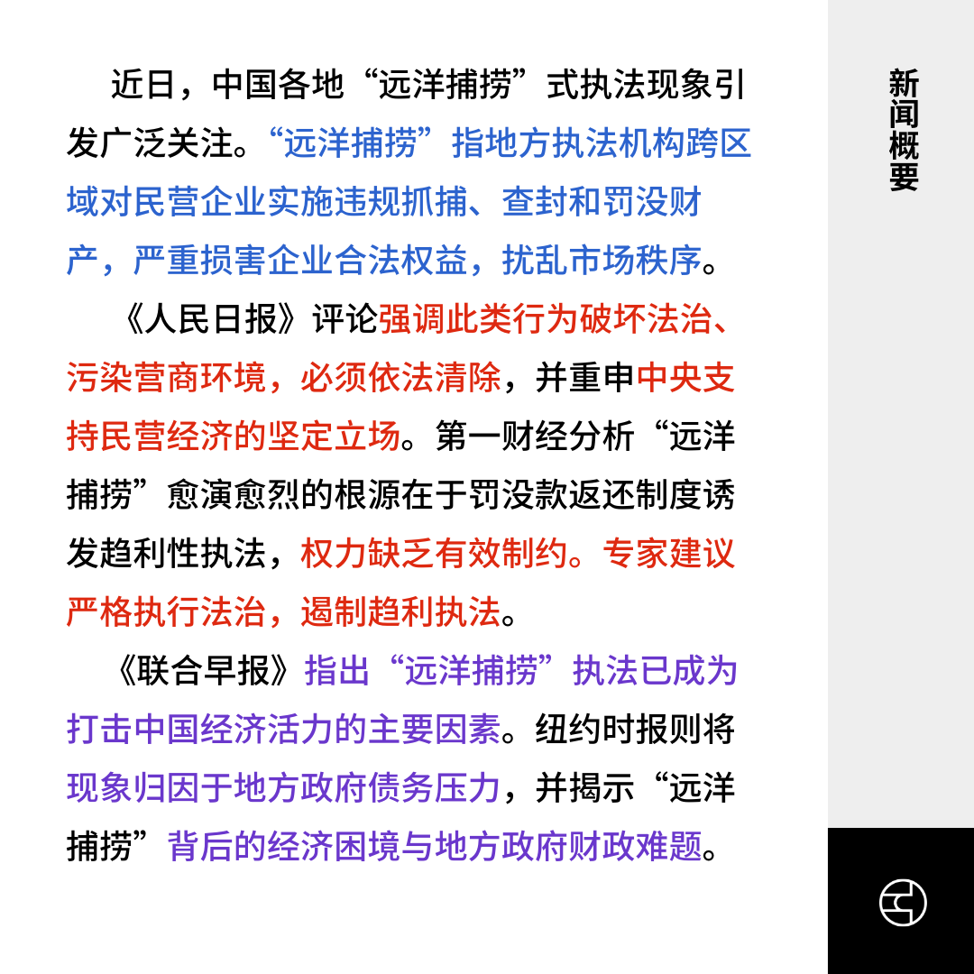 《联合早报》指出“远洋捕捞”执法已成为打击中国经济活力的主要因素。纽约时报则将现象归因于地方政府债务压力,并揭示“远洋捕捞”背后的经济困境与地方政府财政难题。