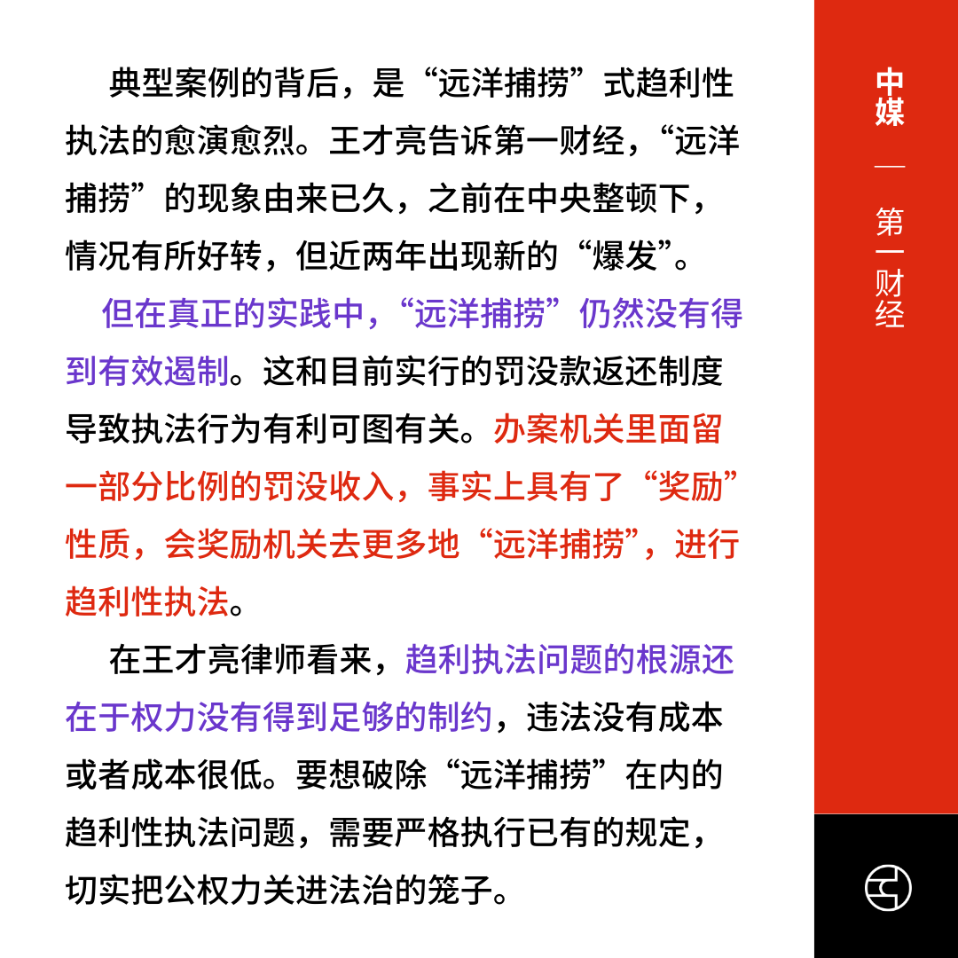 《人民日报》评论强调此类行为破坏法治、污染营商环境,必须依法清除,并重申中央支持民营经济的坚定立场。第一财经分析“远洋捕捞”愈演愈烈的根源在于罚没款返还制度诱发趋利性执法,权力缺乏有效制约。专家建议严格执行法治,遏制趋利执法。