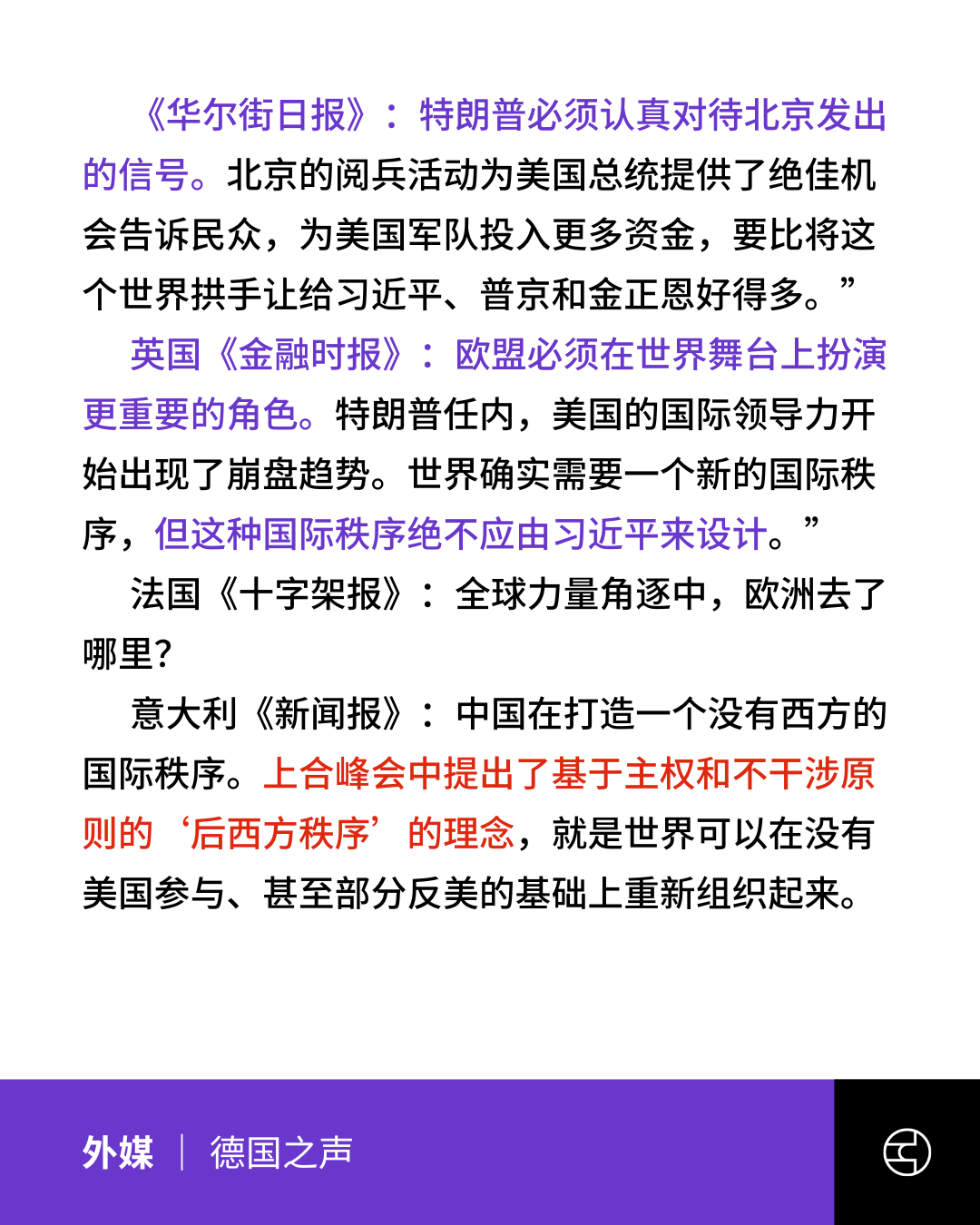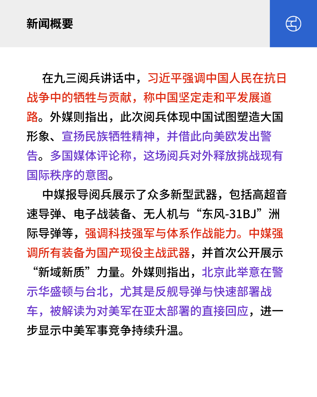 在九三阅兵讲话中,习近平强调中国人民在抗日战争中的牺牲与贡献,称中国坚定走和平发展道路。外媒则指出,此次阅兵体现中国试图塑造大国形象、宣扬民族牺牲精神,并借此向美欧发出警告。多国媒体评论称,这场阅兵对外释放挑战现有国际秩序的意图。