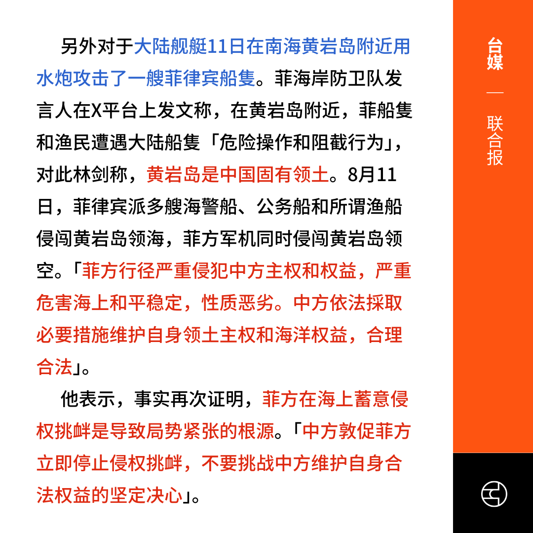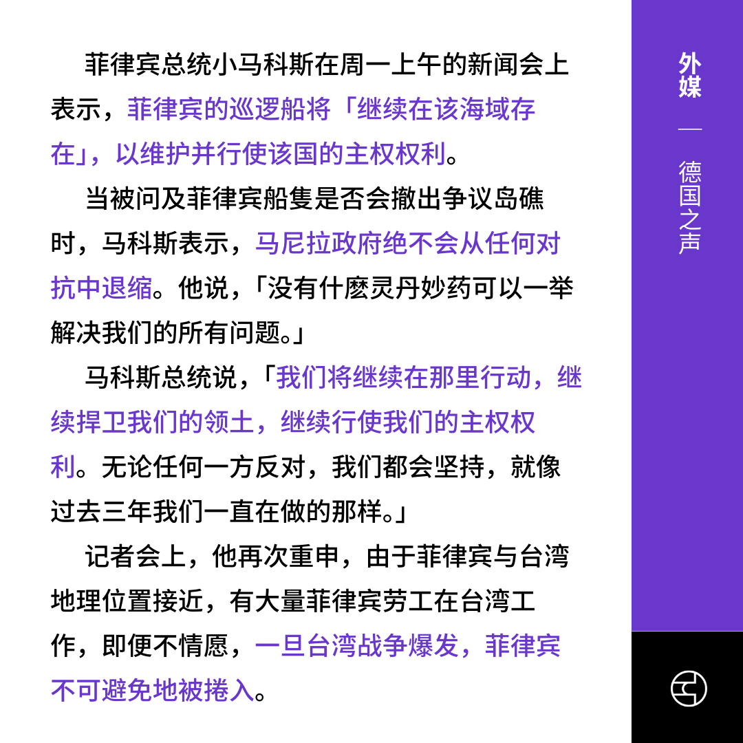 菲律宾总统小马科斯称,菲律宾巡逻船将继续在相关海域行动,以行使主权权利,不会在对抗中退缩。并重複提到,因地理位置与劳工因素,一旦台湾爆发战争,菲律宾恐难置身事外。