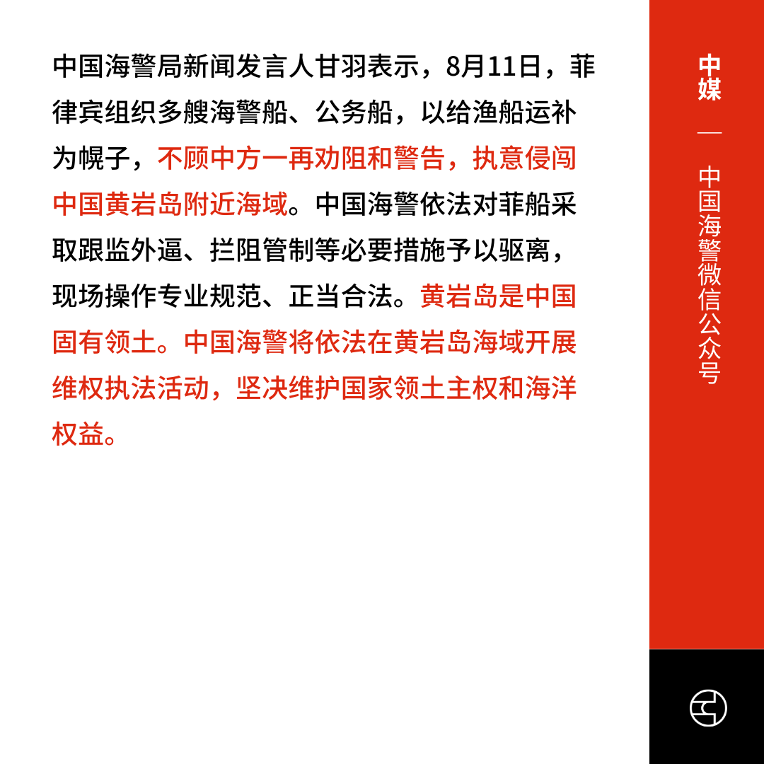 《中国海警微信公众号》中国海警局新闻发言人就菲船只侵闯黄岩岛附近海域发表谈话