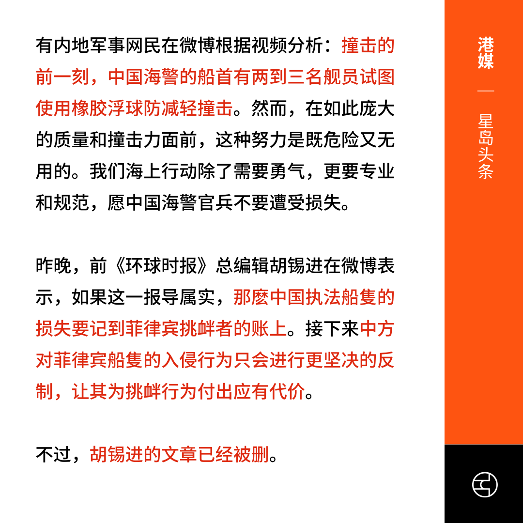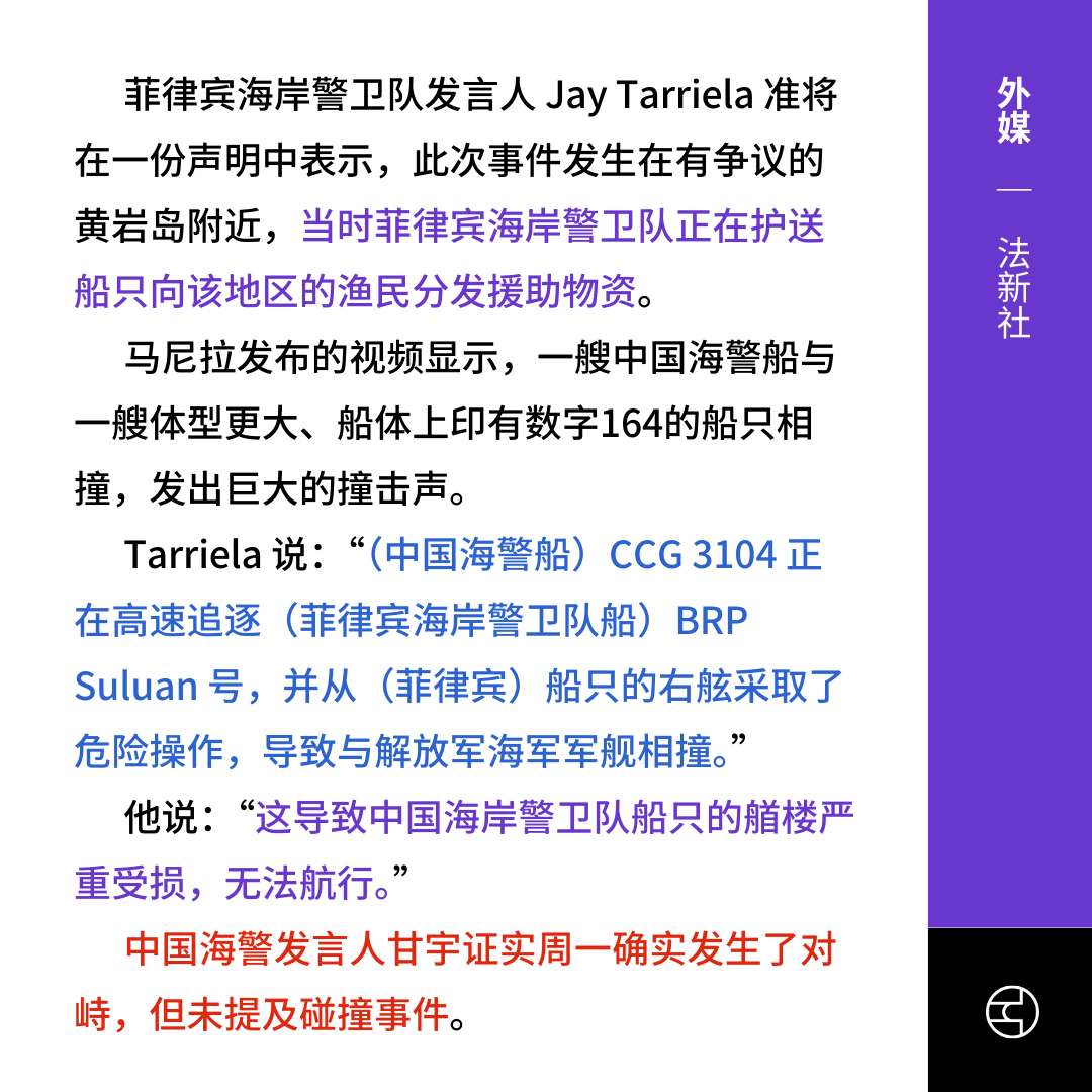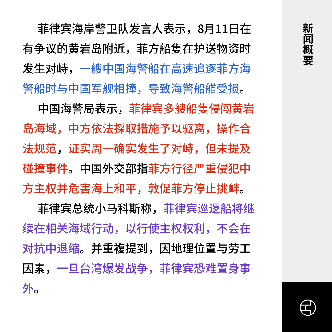 菲律宾海岸警卫队发言人表示,8月11日在有争议的黄岩岛附近,菲方船隻在护送物资时发生对峙,一艘中国海警船在高速追逐菲方海警船时与中国军舰相撞,导致海警船艏受损。