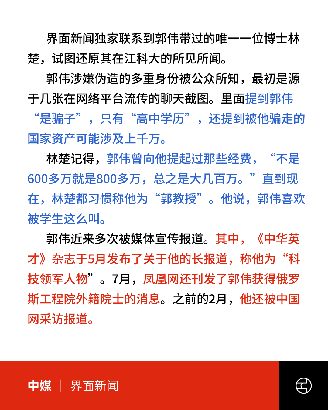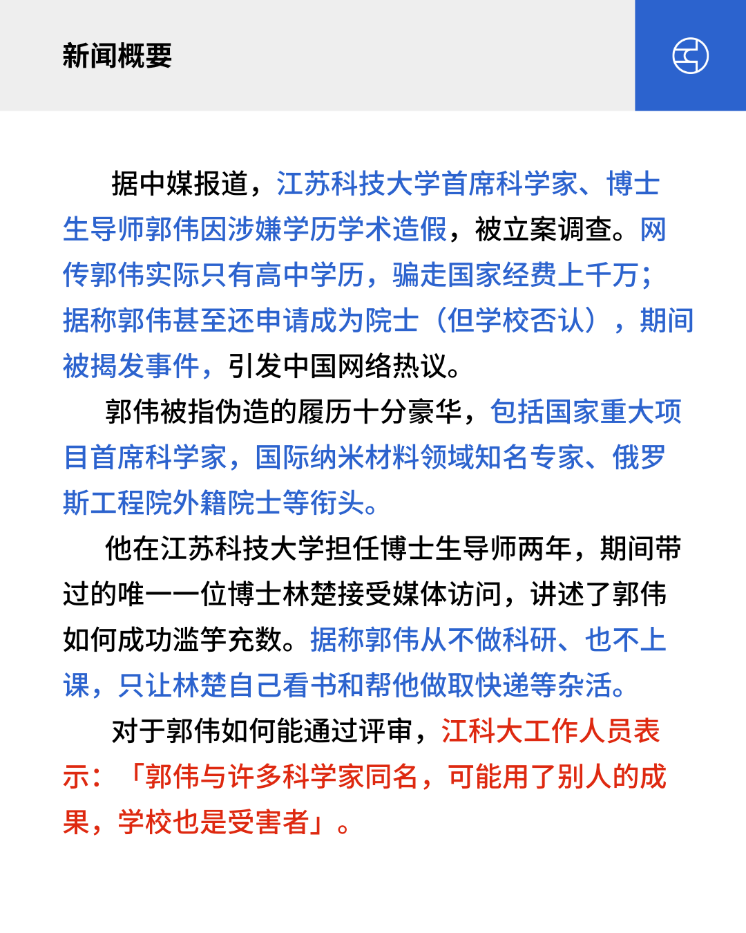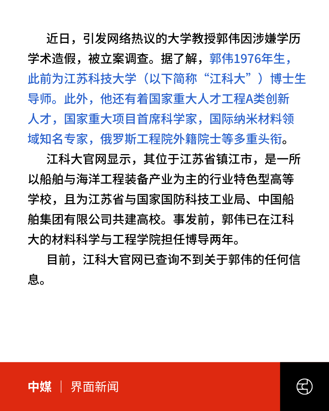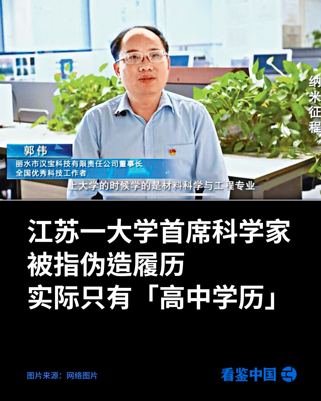 据中媒报道,江苏科技大学首席科学家、博士生导师郭伟因涉嫌学历学术造假,被立案调查。网传郭伟实际只有高中学历,骗走国家经费上千万;据称郭伟甚至还申请成为院士(但学校否认),期间被揭发事件,引发中国网络热议。