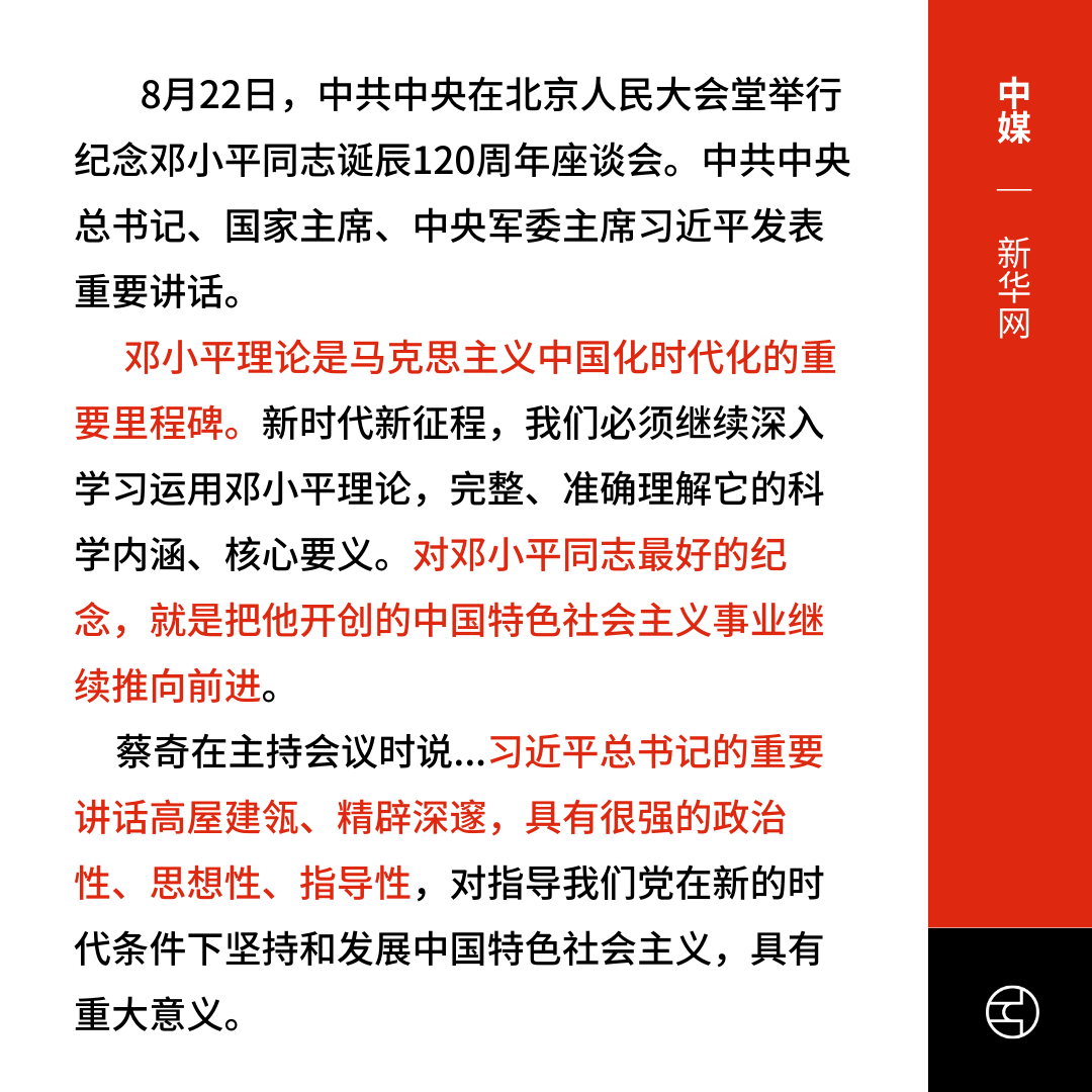 8月22日,中共中央在北京人民大会堂举行纪念邓小平同志诞辰120周年座谈会。