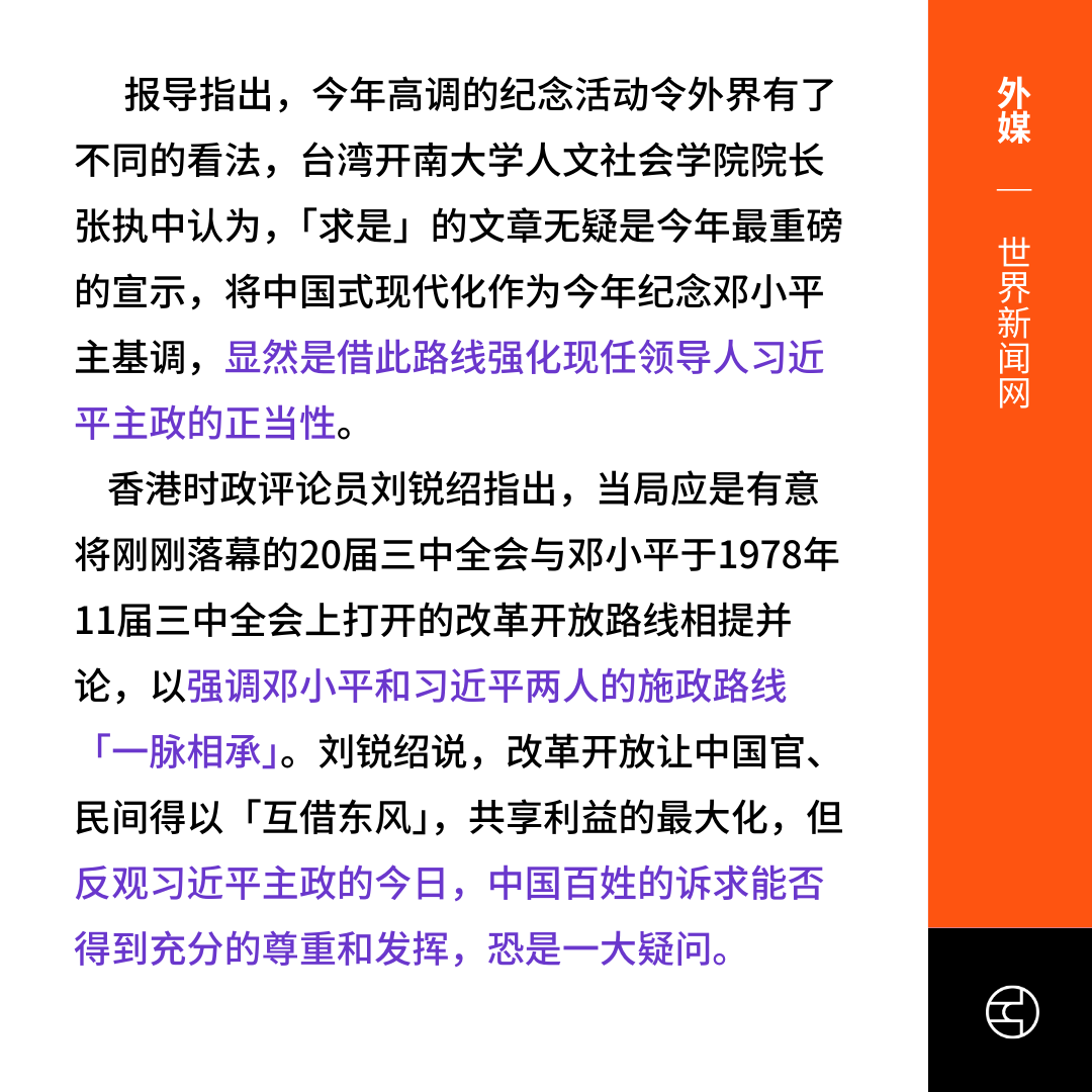 新加坡国立大学副教授表示,当前经济下滑和与美国的竞争环境使人们更加怀念经济强劲增长的时代。北京师范大学院长唐任伍认为,中国人如今的安定生活得益于邓小平,但当前的经济挑战让民众对改革有了新期待。台湾学者张执中则认为,活动旨在强化习近平的执政正当性。而香港评论员刘锐绍质疑现今中国能否如改革开放时期那样充分满足百姓的诉求。