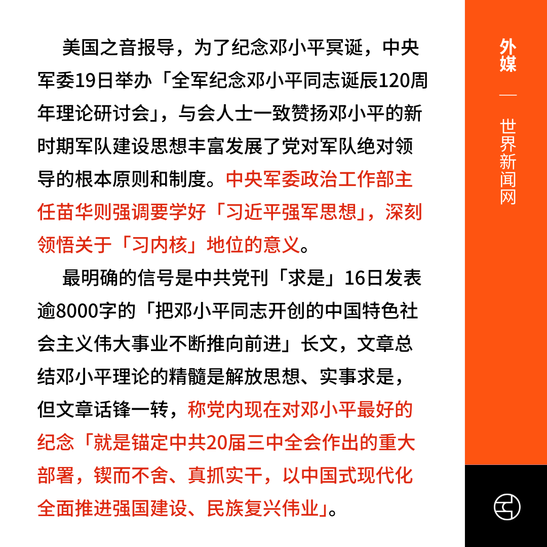《世界新闻网》高调纪念邓小平120岁冥诞 分析:护航习近平集权