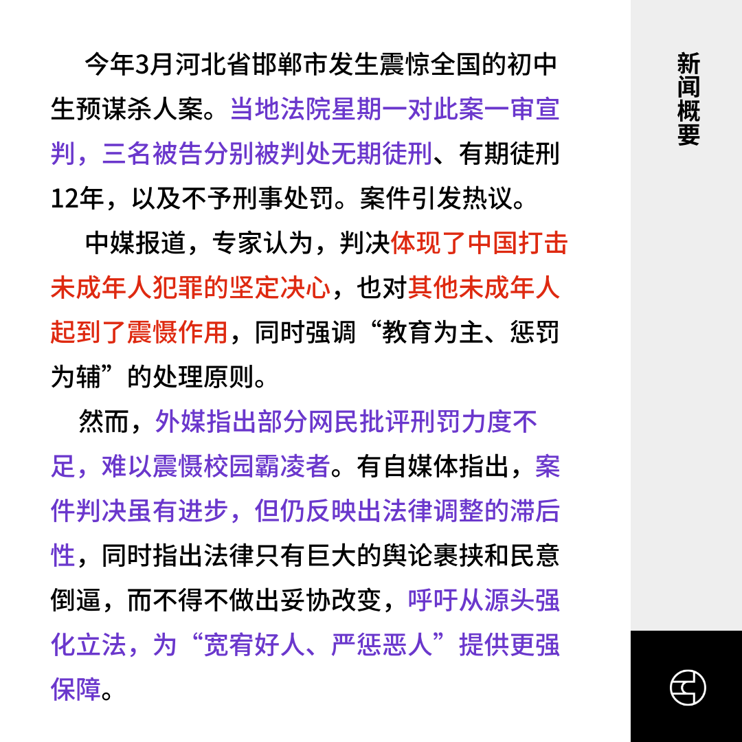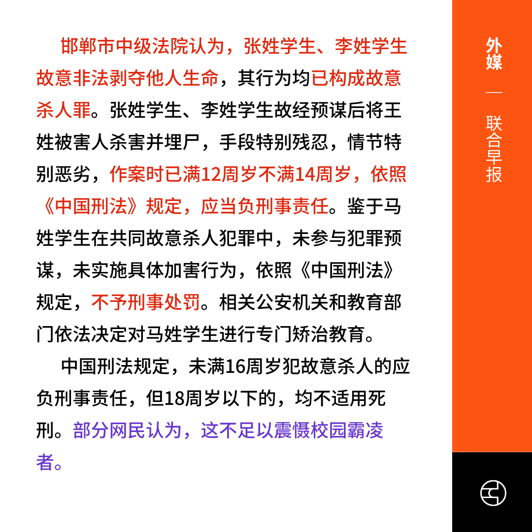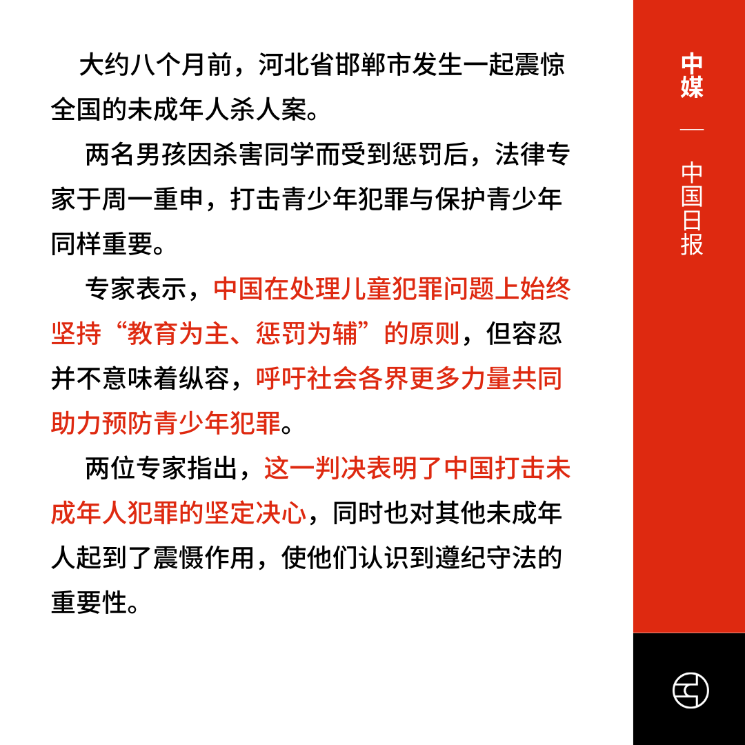 中媒报道,专家认为,判决体现了中国打击未成年人犯罪的坚定决心,也对其他未成年人起到了震慑作用,同时强调“教育为主、惩罚为辅”的处理原则。