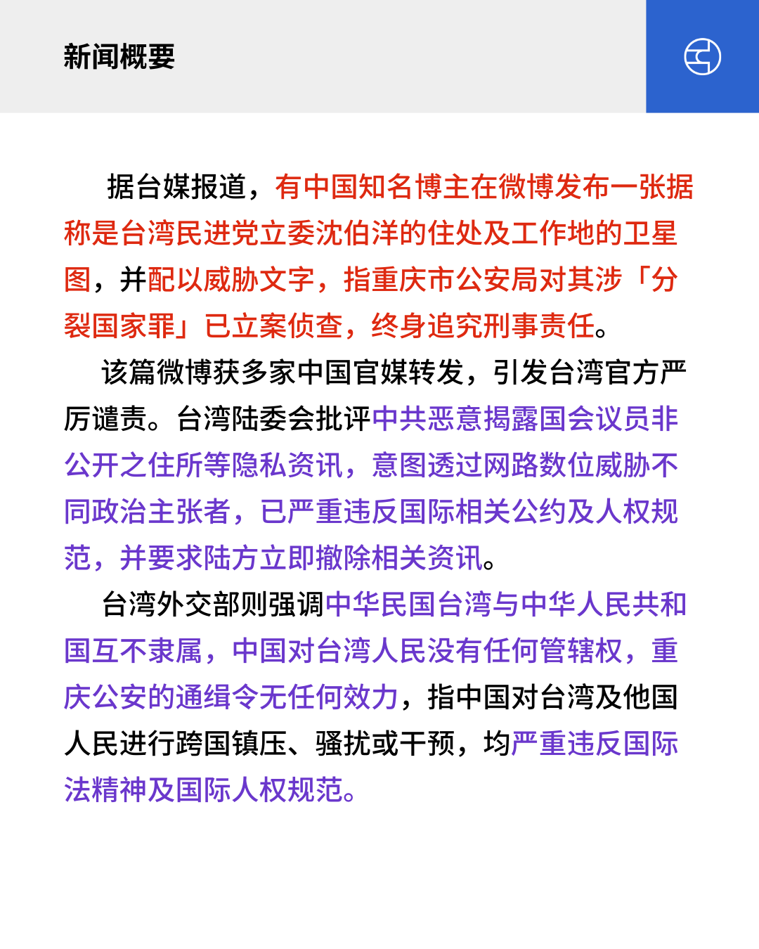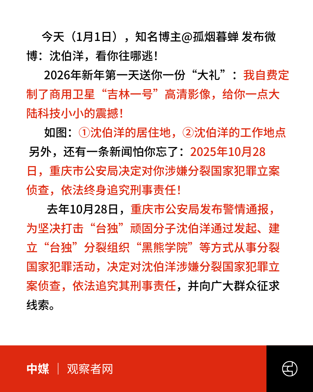 据台媒报道,有中国知名博主在微博发布一张据称是台湾民进党立委沈伯洋的住处及工作地的卫星图,并配以威胁文字,指重庆市公安局对其涉「分裂国家罪」已立案侦查,终身追究刑事责任。