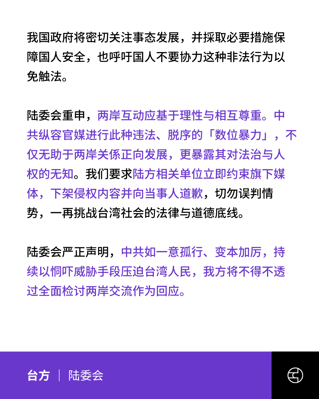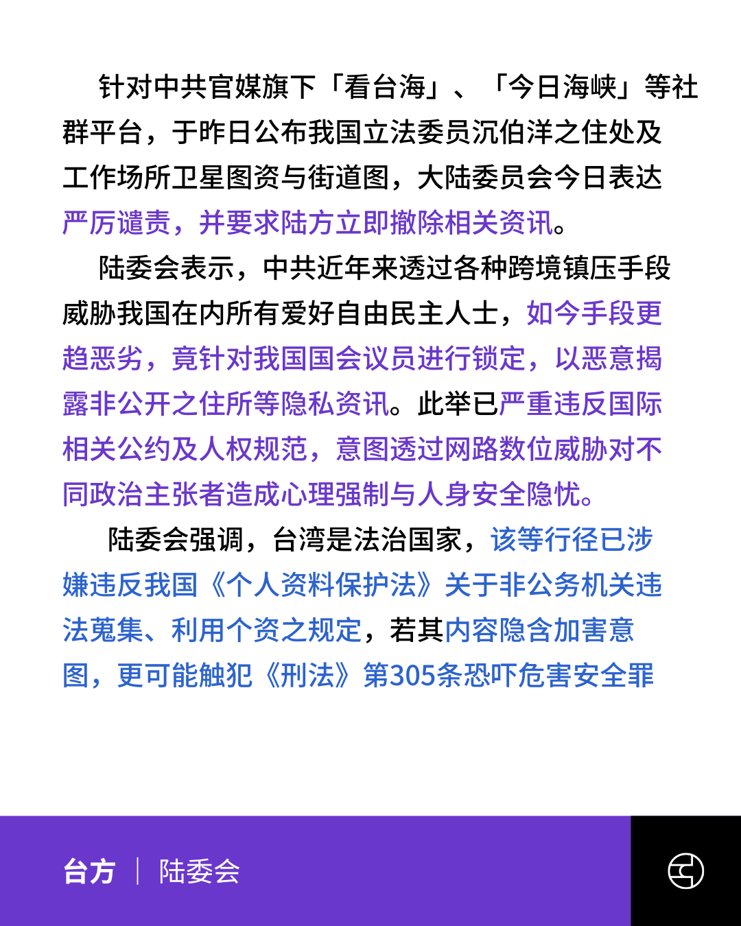 《中華民國大陸委員會》中共官媒惡意揭露我立委隱私,陸委會予以嚴厲譴責並警告勿觸法網