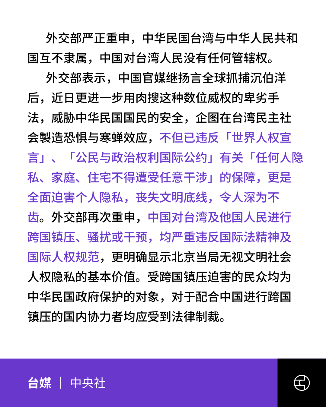 台湾外交部则强调中华民国台湾与中华人民共和国互不隶属,中国对台湾人民没有任何管辖权,重庆公安的通缉令无任何效力,指中国对台湾及他国人民进行跨国镇压、骚扰或干预,均严重违反国际法精神及国际人权规范。