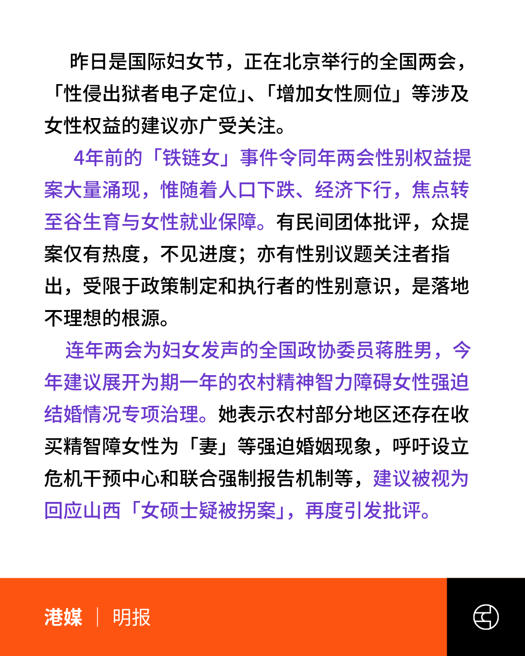 另外,全国政协委员蒋胜男建议展开农村精神智力障碍和女性强迫结婚情况专项治理,引发关注和讨论,建议被视为回应山西「女硕士疑被拐案」。