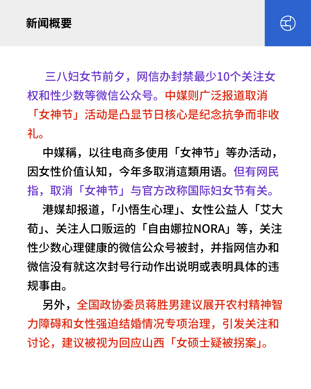 三八妇女节前夕,网信办封禁最少10个关注女权和性少数等微信公众号。中媒则广泛报道取消「女神节」活动是凸显节日核心是纪念抗争而非收礼。