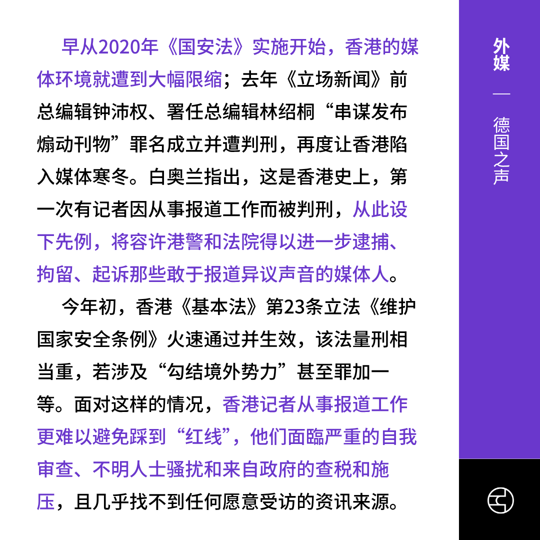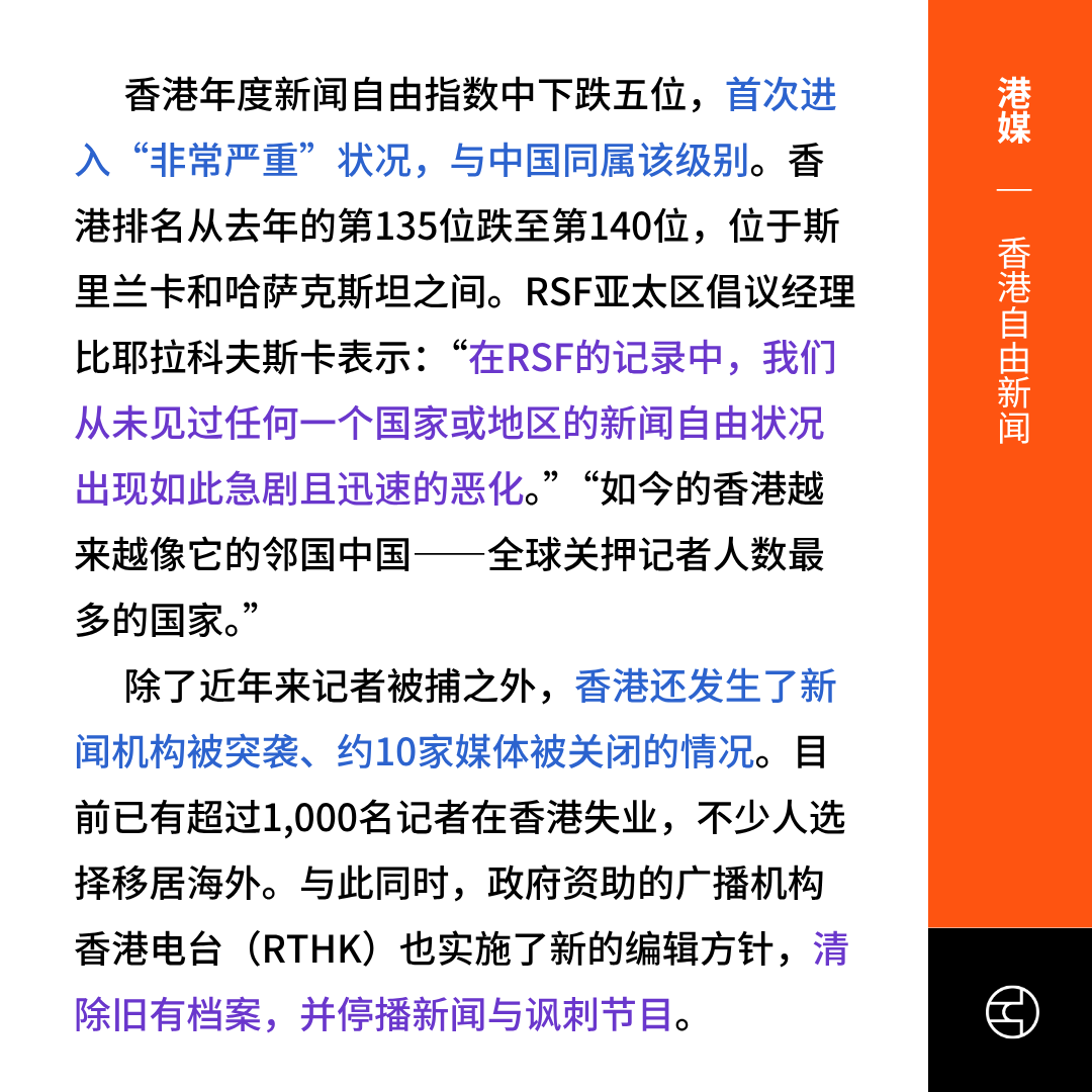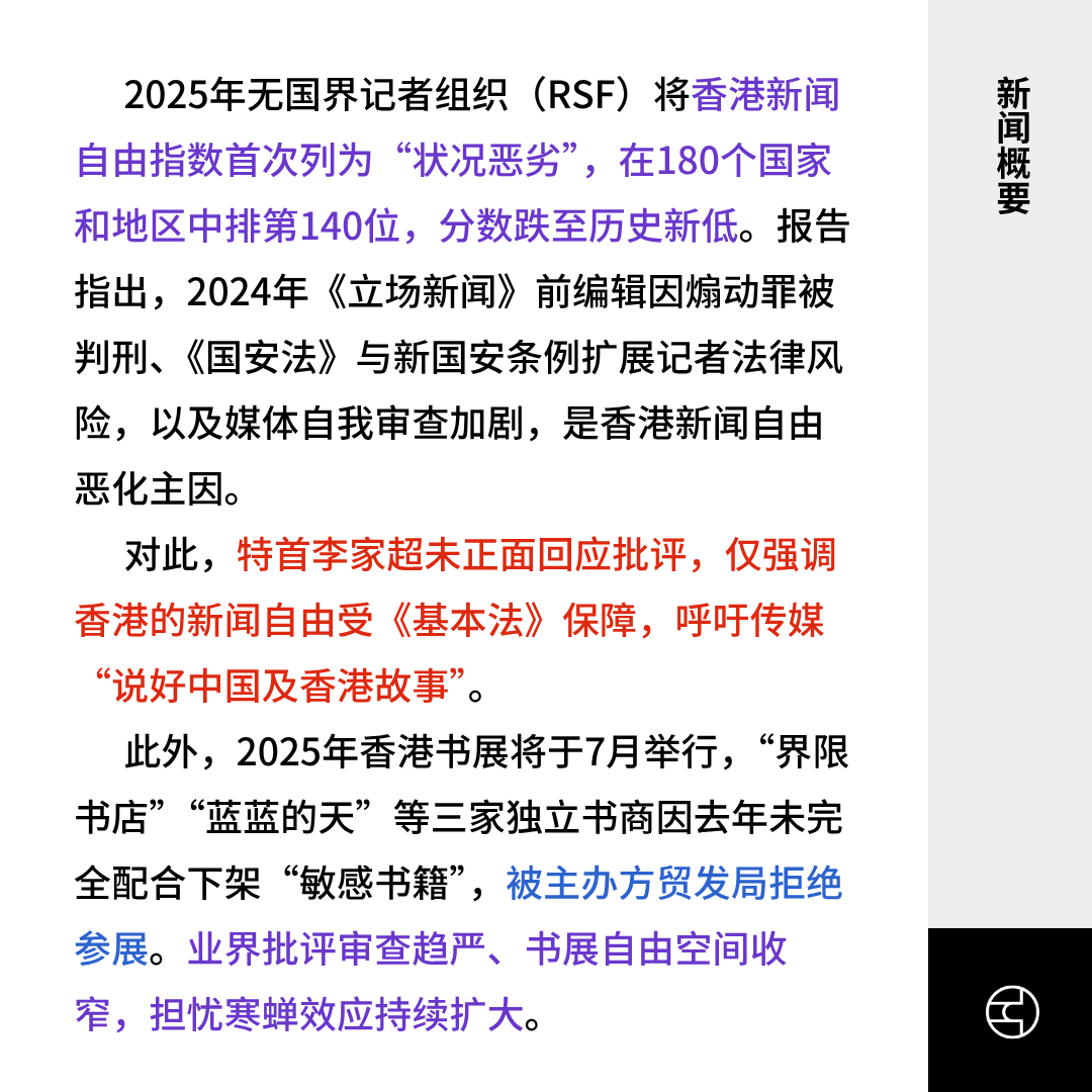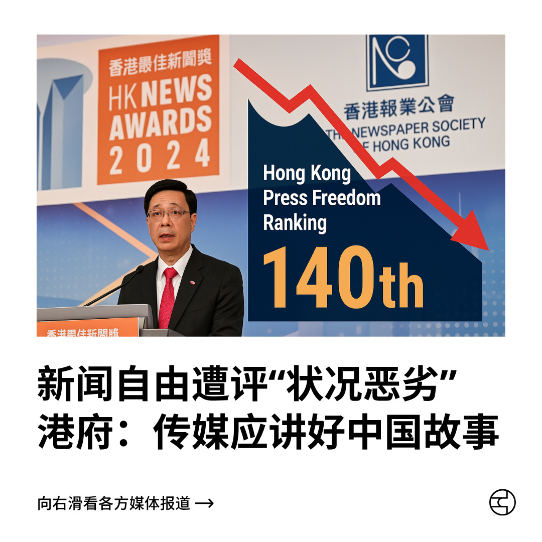 2025年无国界记者组织(RSF)将香港新闻自由指数首次列为“状况恶劣”,在180个国家和地区中排第140位,分数跌至历史新低。报告指出,2024年《立场新闻》前编辑因煽动罪被判刑、《国安法》与新国安条例扩展记者法律风险,以及媒体自我审查加剧,是香港新闻自由恶化主因。