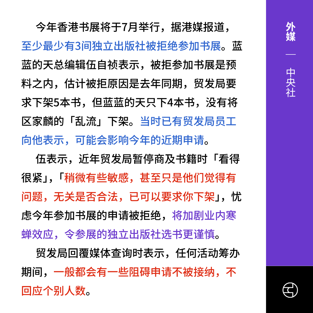 此外,2025年香港书展将于7月举行,“界限书店”“蓝蓝的天”等三家独立书商因去年未完全配合下架“敏感书籍”,被主办方贸发局拒绝参展。业界批评审查趋严、书展自由空间收窄,担忧寒蝉效应持续扩大。