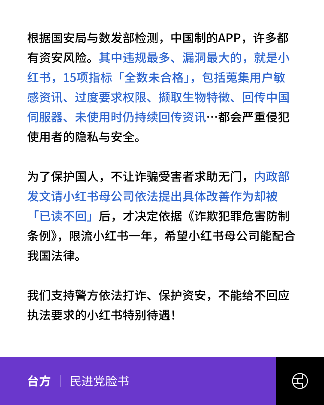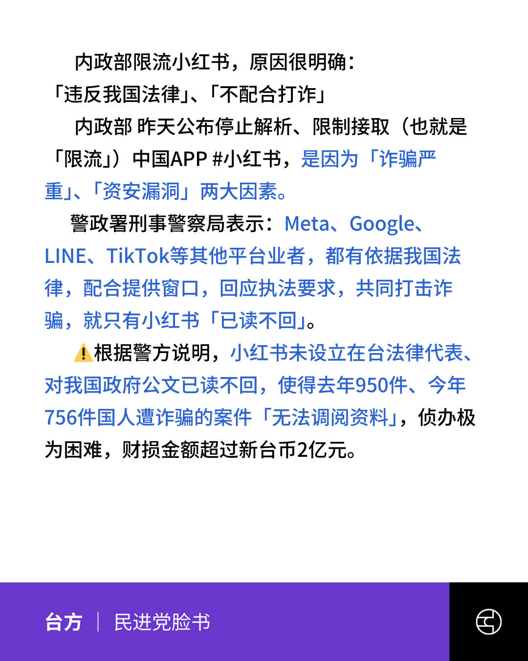 执政民进党的官方脸书提到,小红书诈骗频发,更未有依据台湾法律,配合回应台湾警方的执法要求,一直「已读不回」,当局因此「无法调阅资料」,侦办极为困难,财损金额超过新台币2亿元。又指中国制的APP许多都有资安风险,其中小红书最为严重,涉及过度收集用户敏感资讯等。